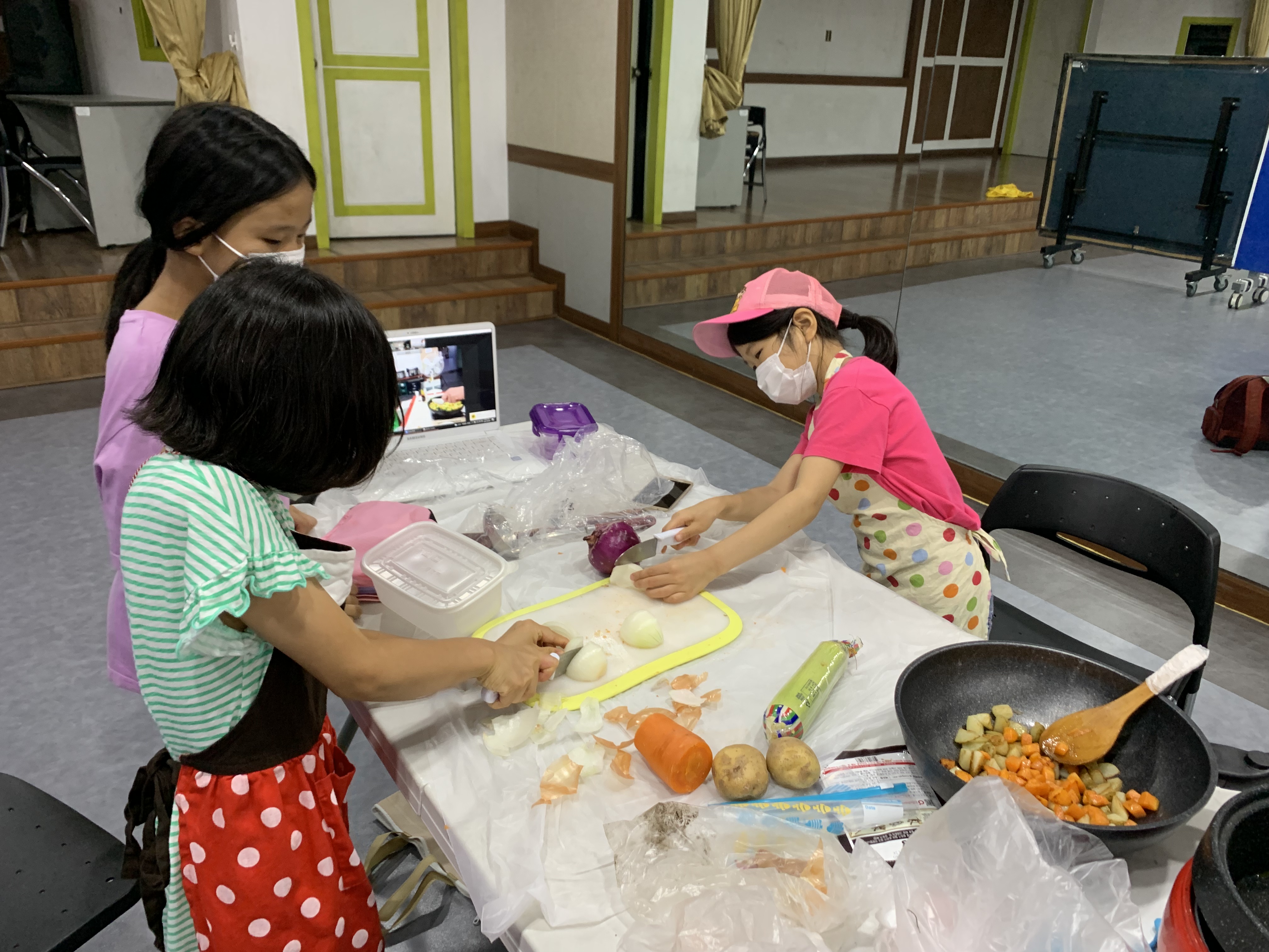 아이들이 직접 감자, 당근, 애호박을 씻고 썰기 시작합니다. 이번엔 양파입니다. 껍질을 까고 감자와 당근처럼 썹니다. 양파가 매워 아이들이 눈 아파했습니다. 눈이 매워 중간에 포기할 수도 있었지만, 아이들은 책임감을 느끼고 끝까지 썰었습니다.