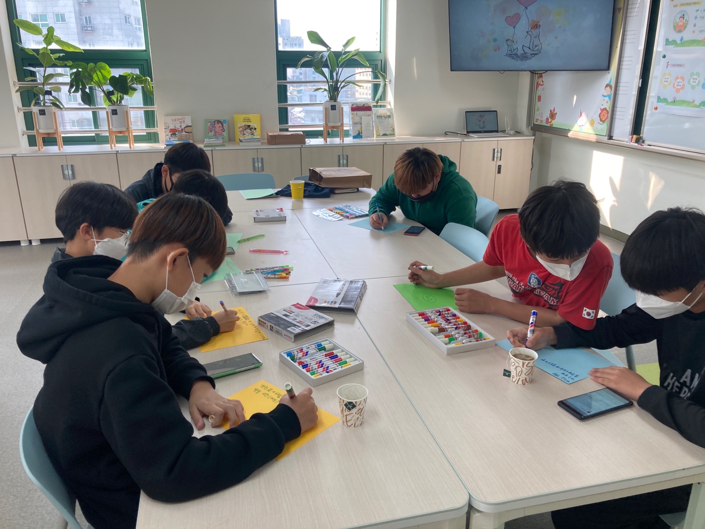 준비해온 이야기를 친구들과 공유하기 위해 각자 종이에 여행지에 관한 내용을 적었습니다.