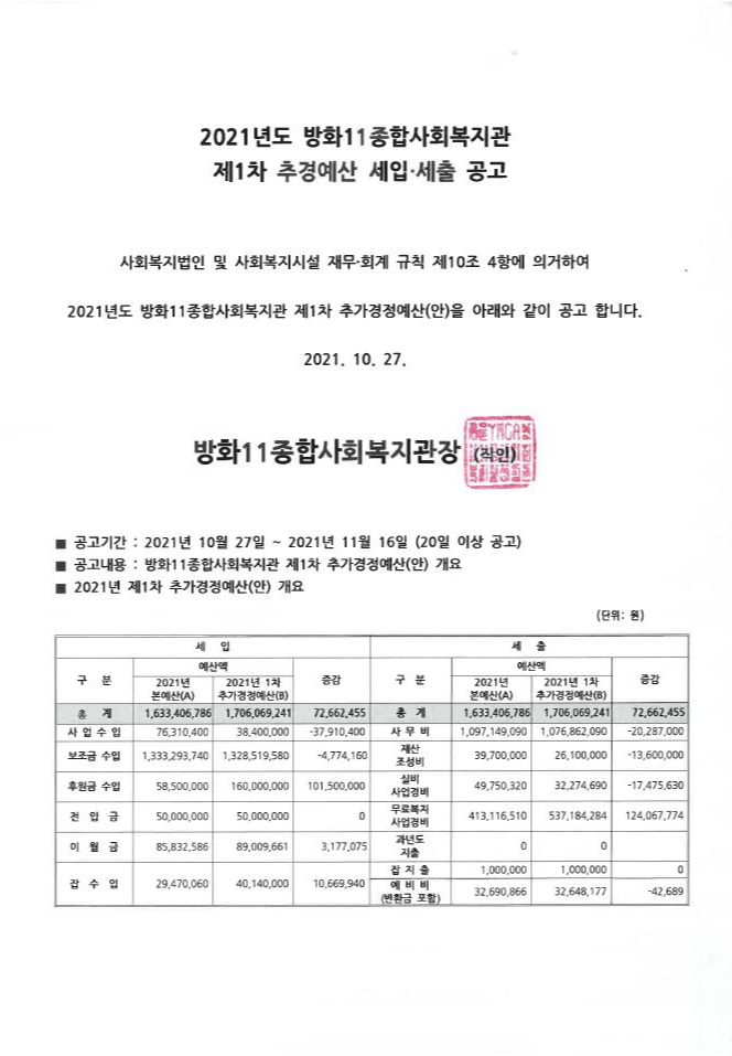 2021년 추경 예산서 공고