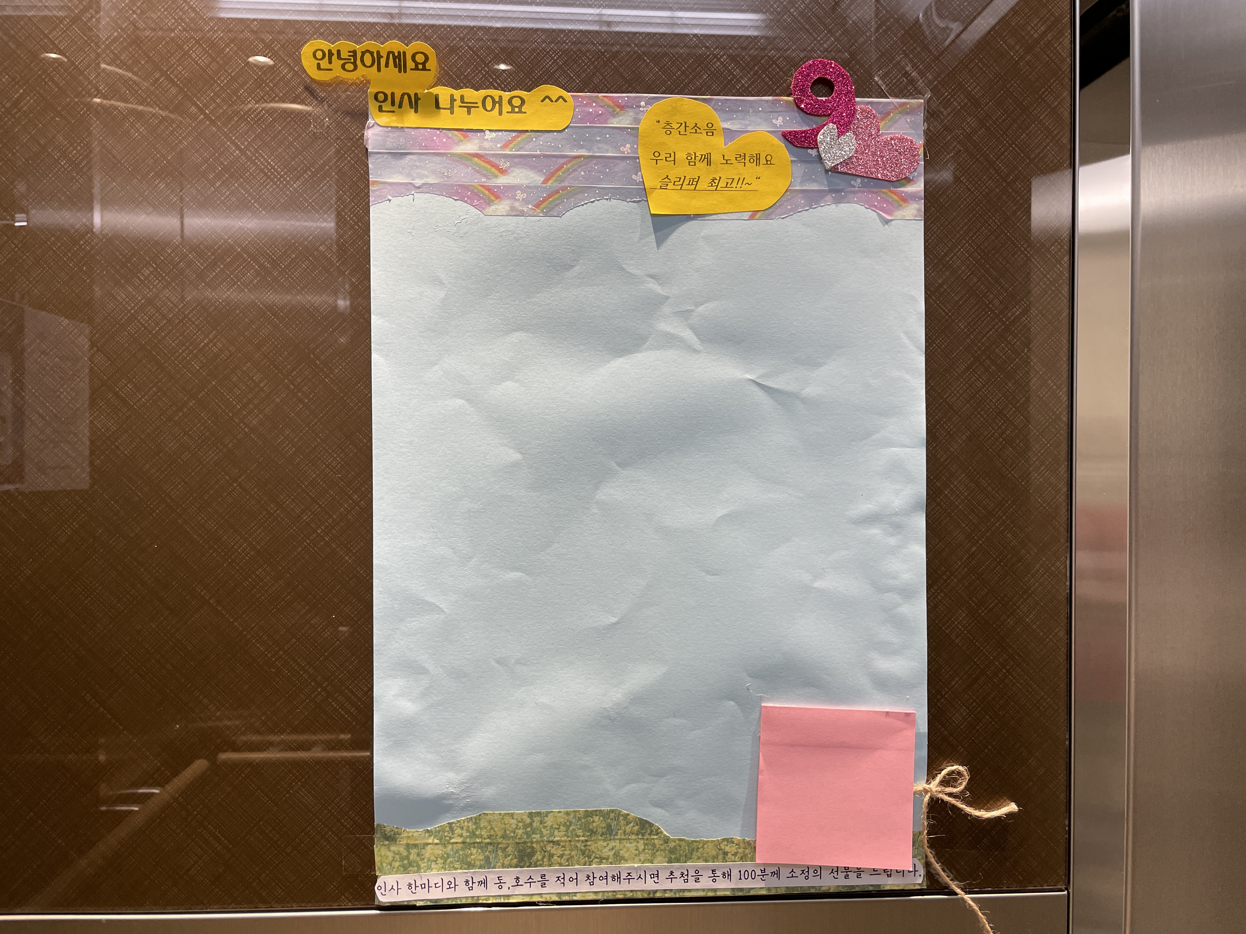 참여해보시니까 어떠셨어요? “좋았어요. 층층별로 다 인사나눠볼 수 있는 기회가 흔치 않으니까요. 이런게 종종 있으면 참 좋겠다 생각했어요. 아이들 교육적으로도 의미 있고요. 애들이 이웃이랑 인사하는걸 엄청 좋아해요. 인사하고 싶어하고.”- 박제철 동대표님 “좋았어요. 재밌었어요. 아무래도 제가 자주 오르내리는 승강기에 부착해뒀다보니까 자주 신경쓰게 되더라고요. 이웃과 소통하는 시간 제안해주셔서 고맙습니다.” - 906동 주민 다른 이웃분들이 쓰신 쪽지 보고 어떠셨어요? “애들이 승강기 탈 때마다 엄청 챙기더라고요. 아무래도 우리가 만들었다보니까 그런거 같아요. 좀 더 챙기게 되는 그런거요.” - 박제철 동대표님 |