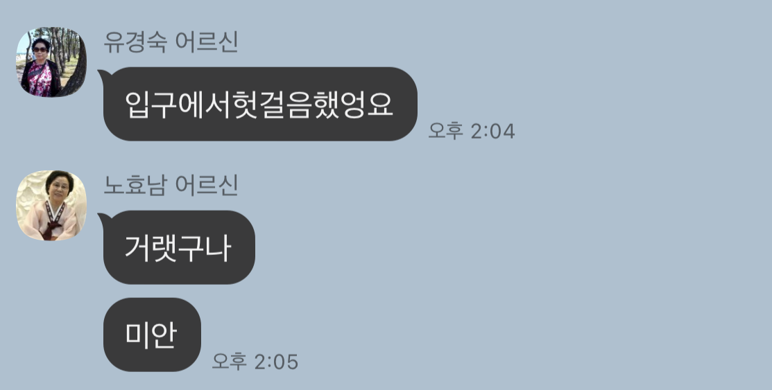 단체채팅방을 가장 많이 이용하시는 노 할머니께서 환영하셨습니다.