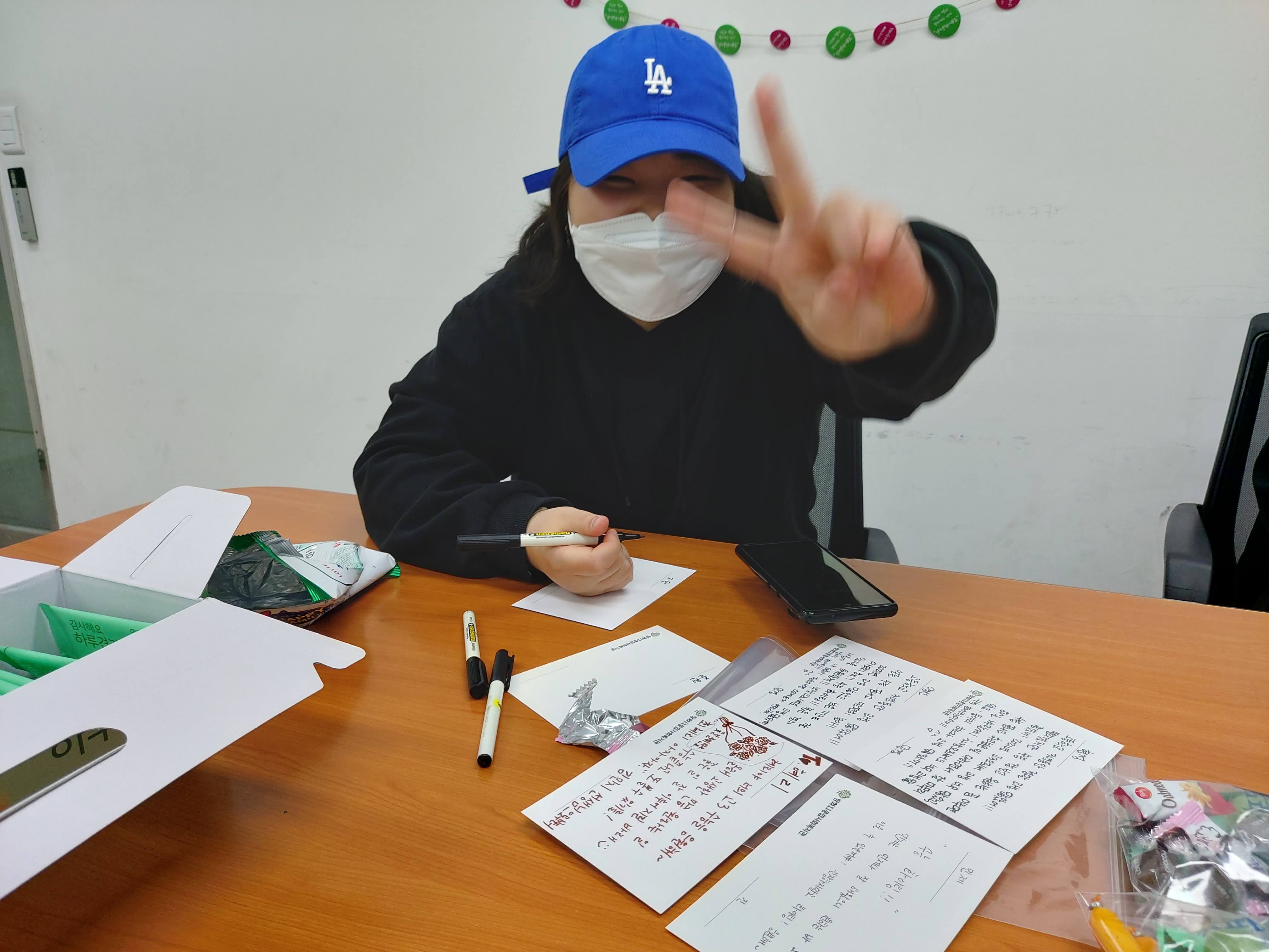 엽서까지 다 써서 간식 꾸러미에 넣고는 응원 모임 준비를 마쳤습니다.