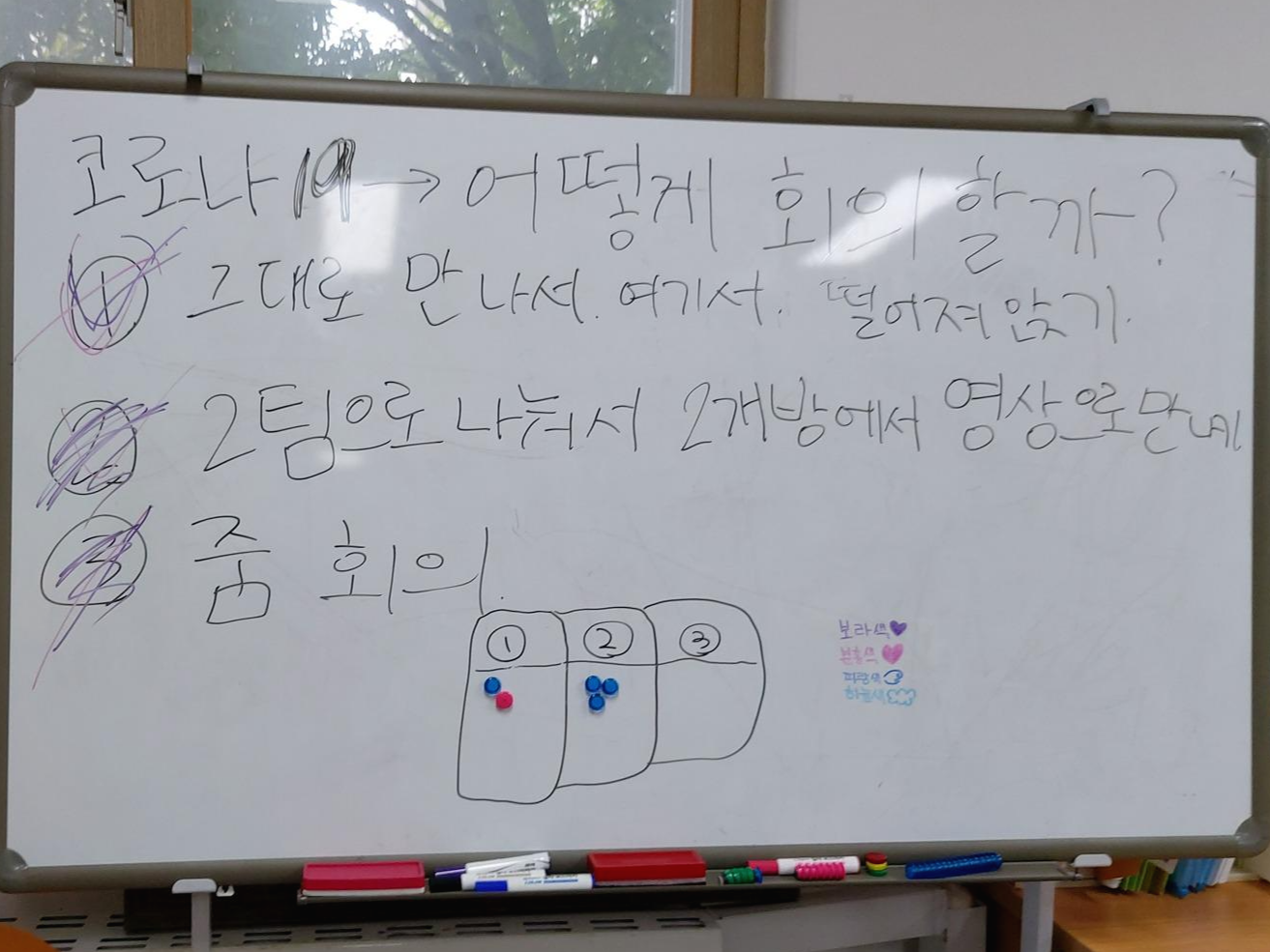 1. 그대로 한 방에서 만나되 거리를 두고 크게 떨어져 앉아서 회의하기