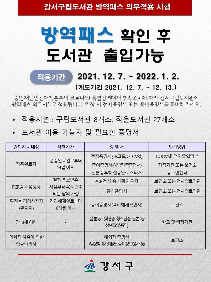 중앙재난안전대책본부의 코로나19 특별방역대책 추가 후속조치에 따라 실내 다중이용시설인 도서관이 방역패스 의무적용시설로 지정되어 운영 변경 사항을 안내드립니다.