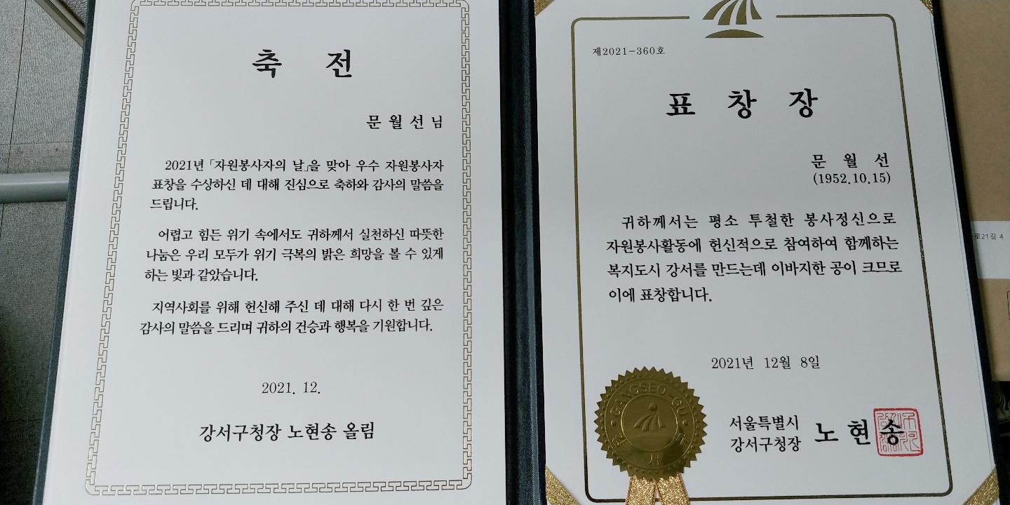 [자원봉사] 모범자원봉사 유공자 문월선씨 강서구청장 표창을 받다.