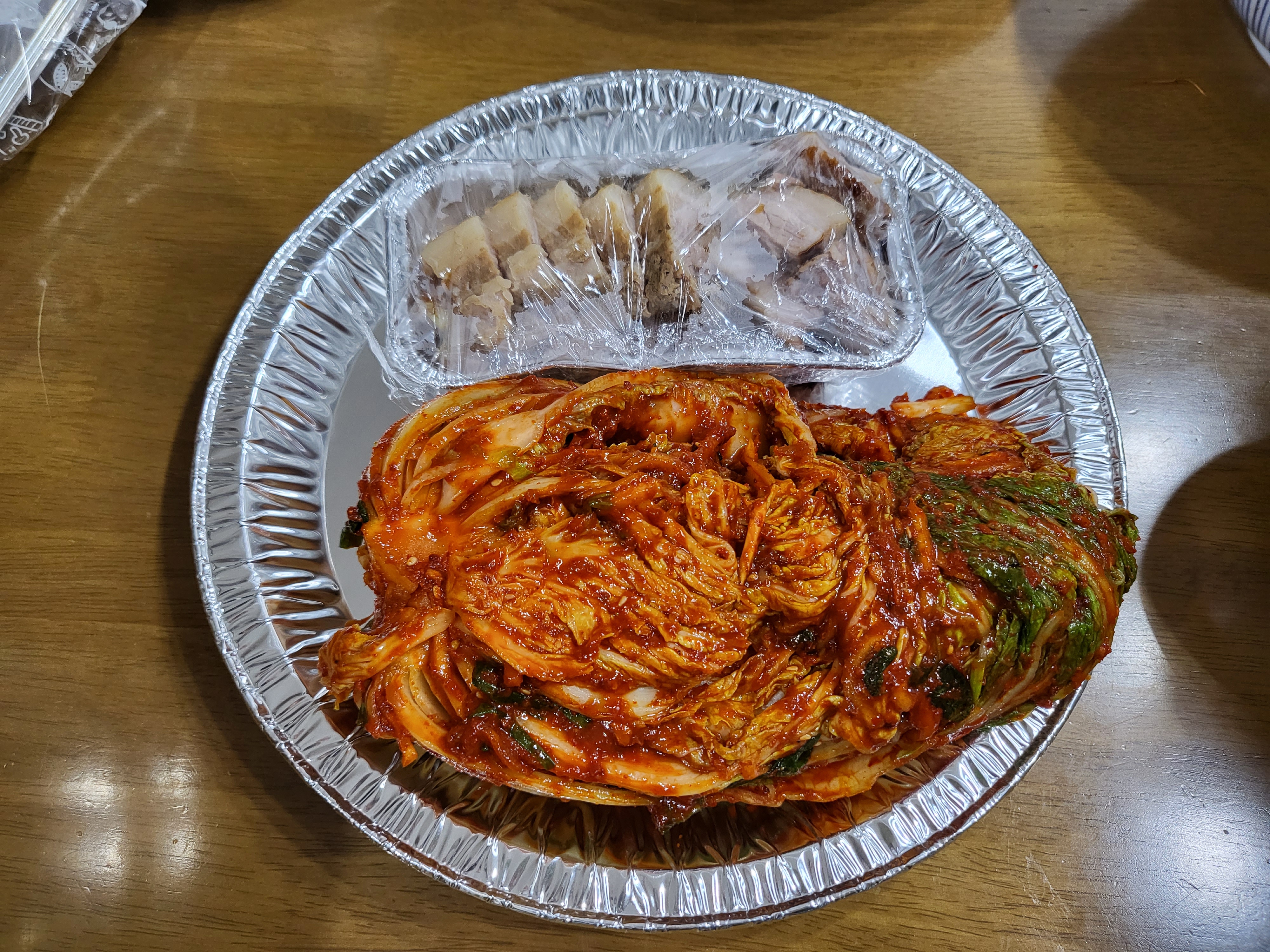 “김치 담그는 김에 수육 삶아서 같이 가지고 왔어요.”