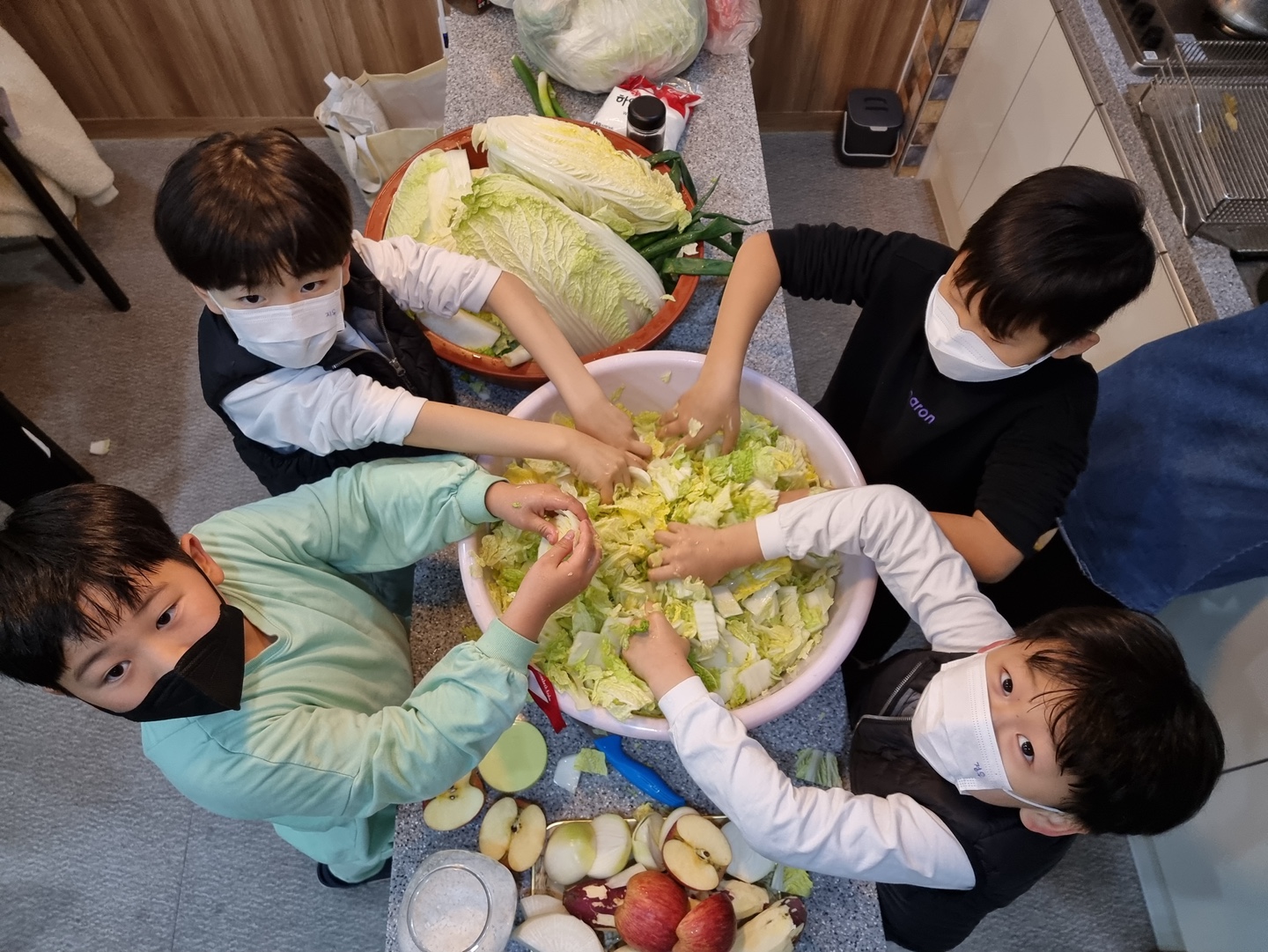 심심할 틈이 없었습니다. 칼질하기 무서워하는 아이는 배추에 손 버무리는 역할을 맡았습니다.