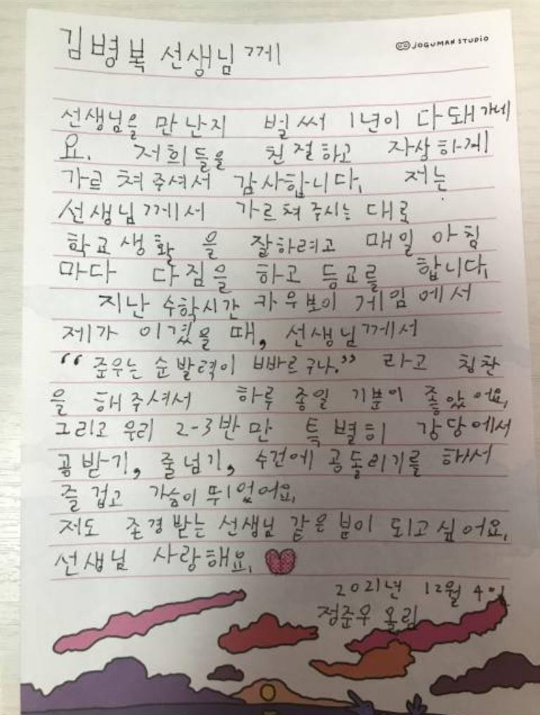 10. 김시우: 선생님에게 편지 드리니 뿌듯하고 선생님이 이렇게 한 해 동안 우리를 지도해주셨다는 게 너무 감사해요. 선생님 감사해요!