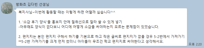 이전 홍보지에 넣어둔 ‘5학년 2반에서 편지지를 받을 수 있다.’라는 문구가 ‘선생님의 편지지를 사용해야 한다.’로 이해됐습니다.