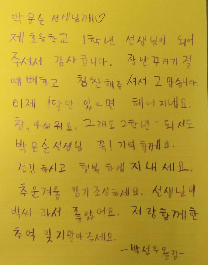 10. 김시우: 선생님에게 편지 드리니 뿌듯하고 선생님이 이렇게 한 해 동안 우리를 지도해주셨다는 게 너무 감사해요. 선생님 감사해요!