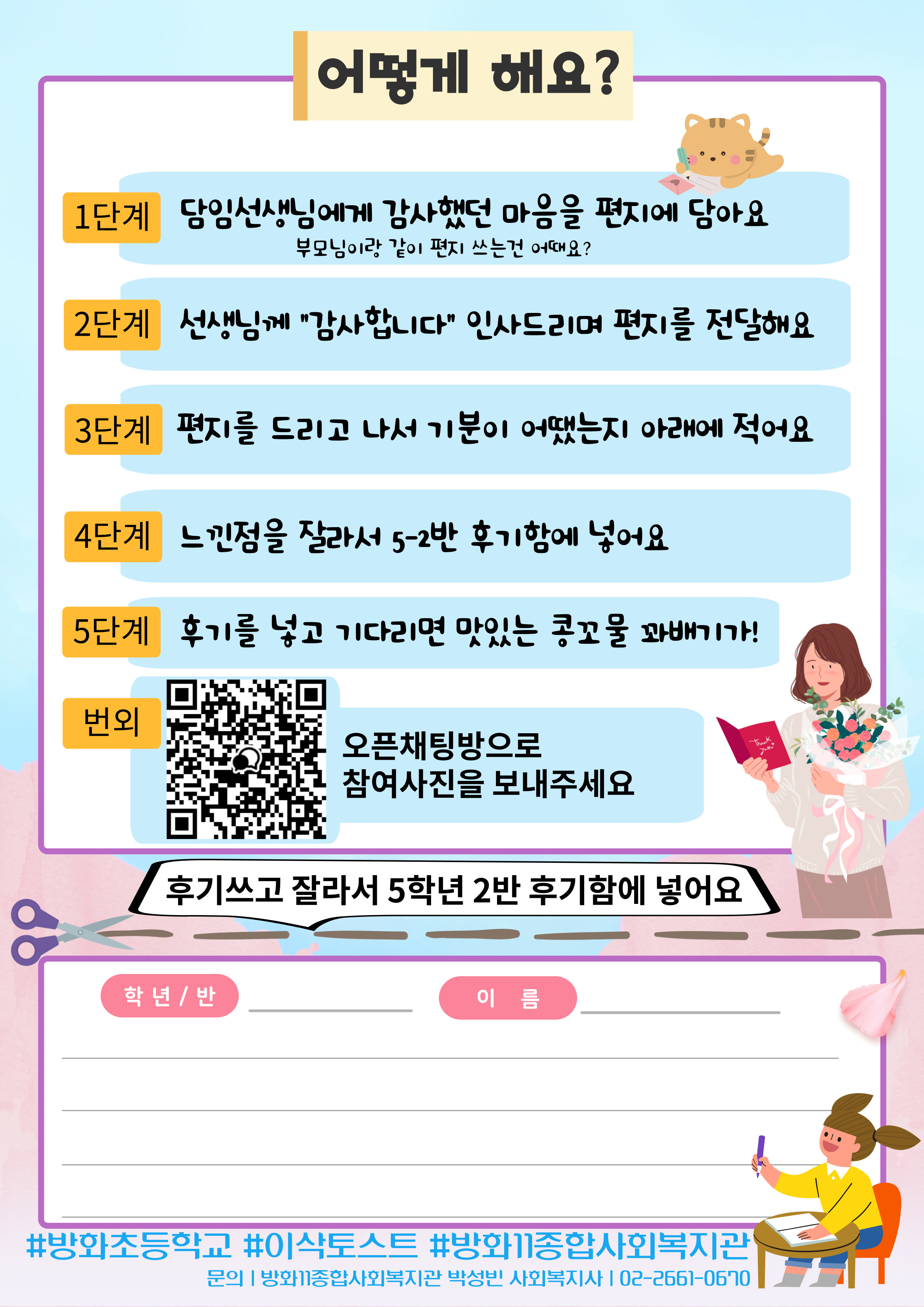 이전 홍보지에 넣어둔 ‘5학년 2반에서 편지지를 받을 수 있다.’라는 문구가 ‘선생님의 편지지를 사용해야 한다.’로 이해됐습니다.