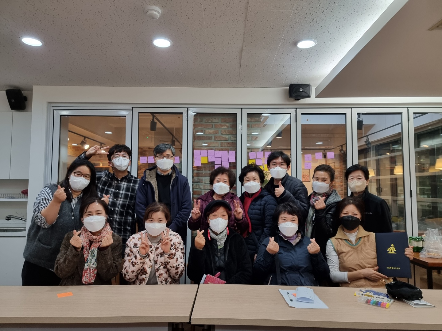 이렇게 워크숍을 마무리 했습니다. 영상을 보며 워크숍을 하며 주민들이 자신 이야기를 많이 나누었습니다. 서로 잘 듣고 응원하고 반응했습니다. 첫 시작에는 조금 딱딱했는데 끝날 때 웃음이 떠나지 않았습니다. 비슷한 집 방향에 사는 단원들은 함께 귀가했습니다. 내년에 코로나19 상황이 좋아지면 그때는 식사도 하고 나들이도 가고 희망드림단 활동도 더 확장하자고 했습니다. 공항동 협력주민 교육, 풍성했습니다.