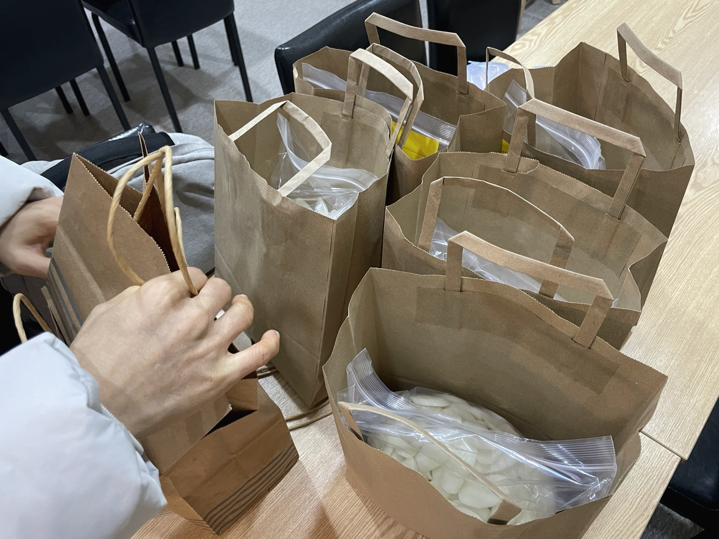 해바라기 님이 쇼핑백, 지퍼백, 비닐장갑 등을 챙겨 오셨습니다. 준비된 떡을 지퍼백에 담았습니다.