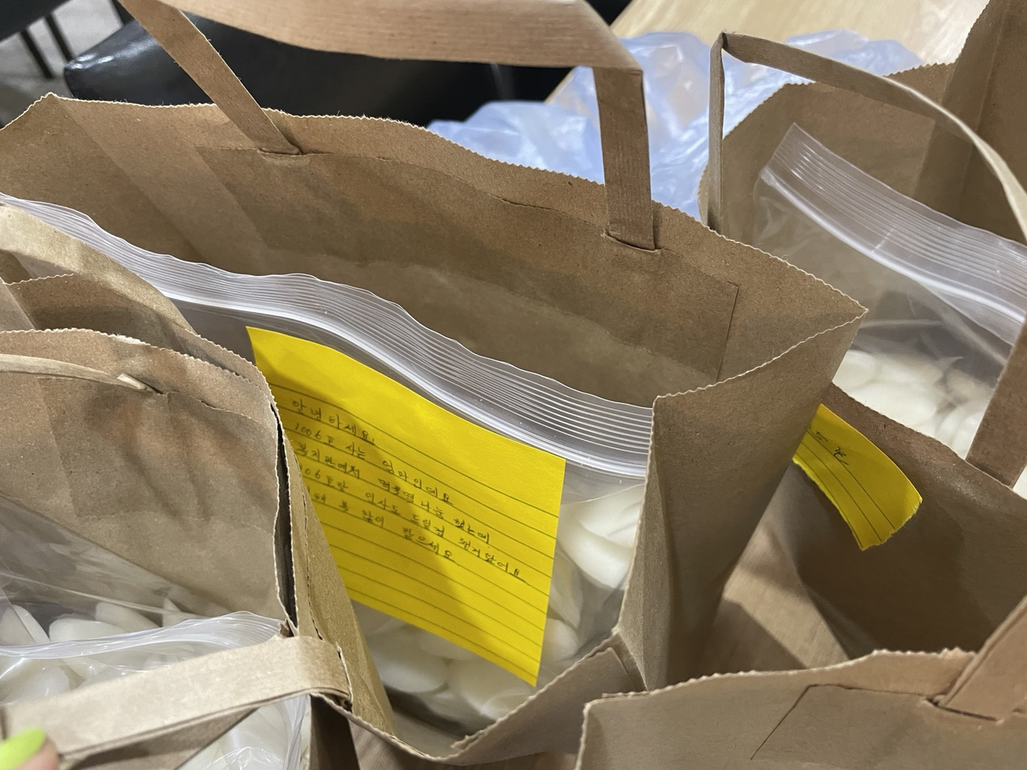 “윗집에서 왔어요~ 저는 방화11복지관 사회복지사인데요, 복지관에서 이번에 떡국 떡을 만들었어요~