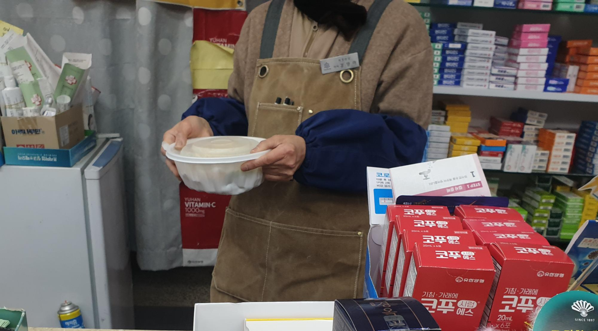 “안녕하세요. 강옥이 어머님이 떡국을 끓였는데 약사님께도 드렸으면 좋겠다고 하셔서 대신 가지고 왔어요. 저는 방화11종합사회복지관 사회복지사에요.”