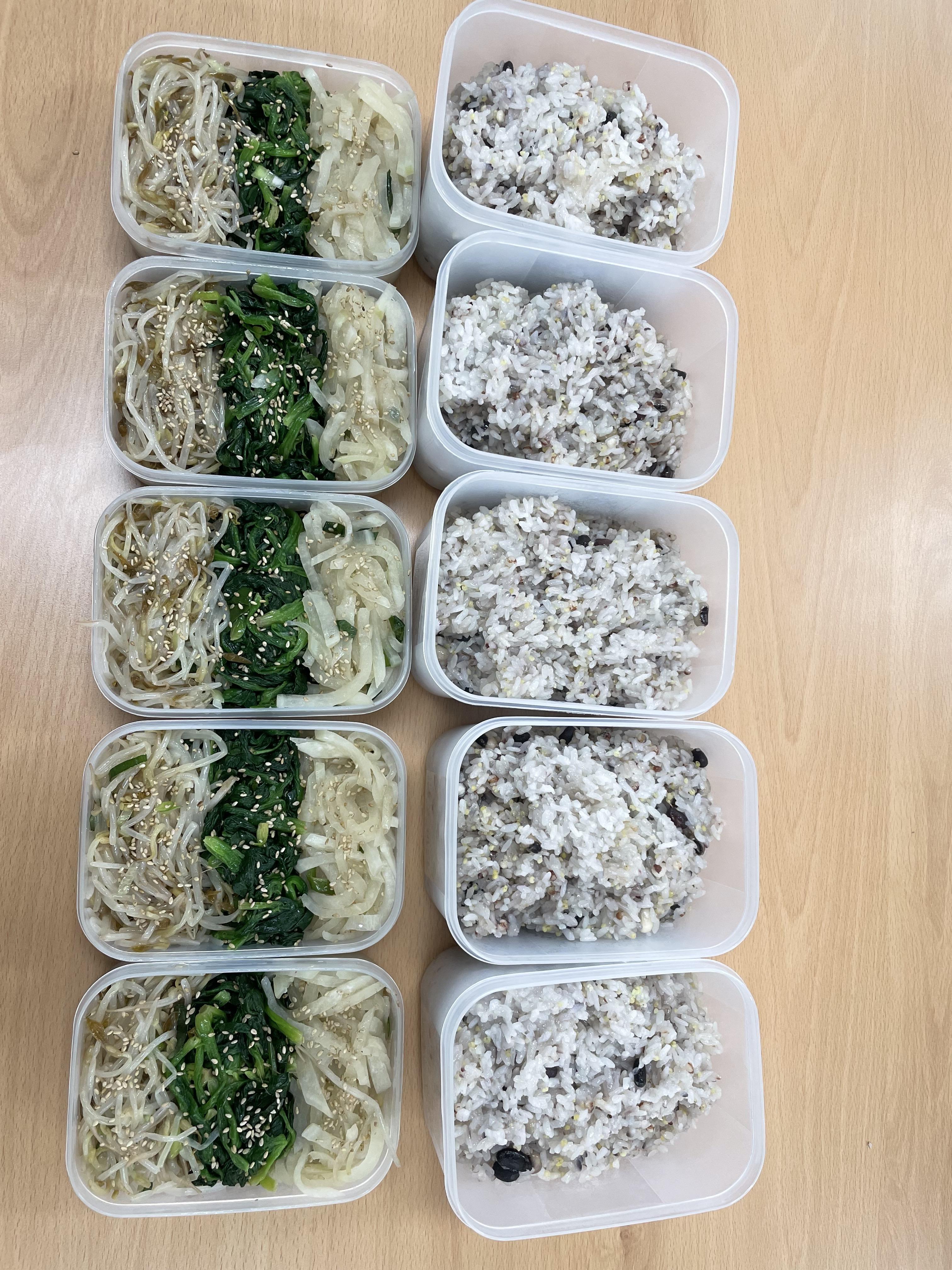 나 반장님께서 보기 좋아야 음식도 맛있다며 시금치나물을 반찬통 가운데에 놓으셨습니다.