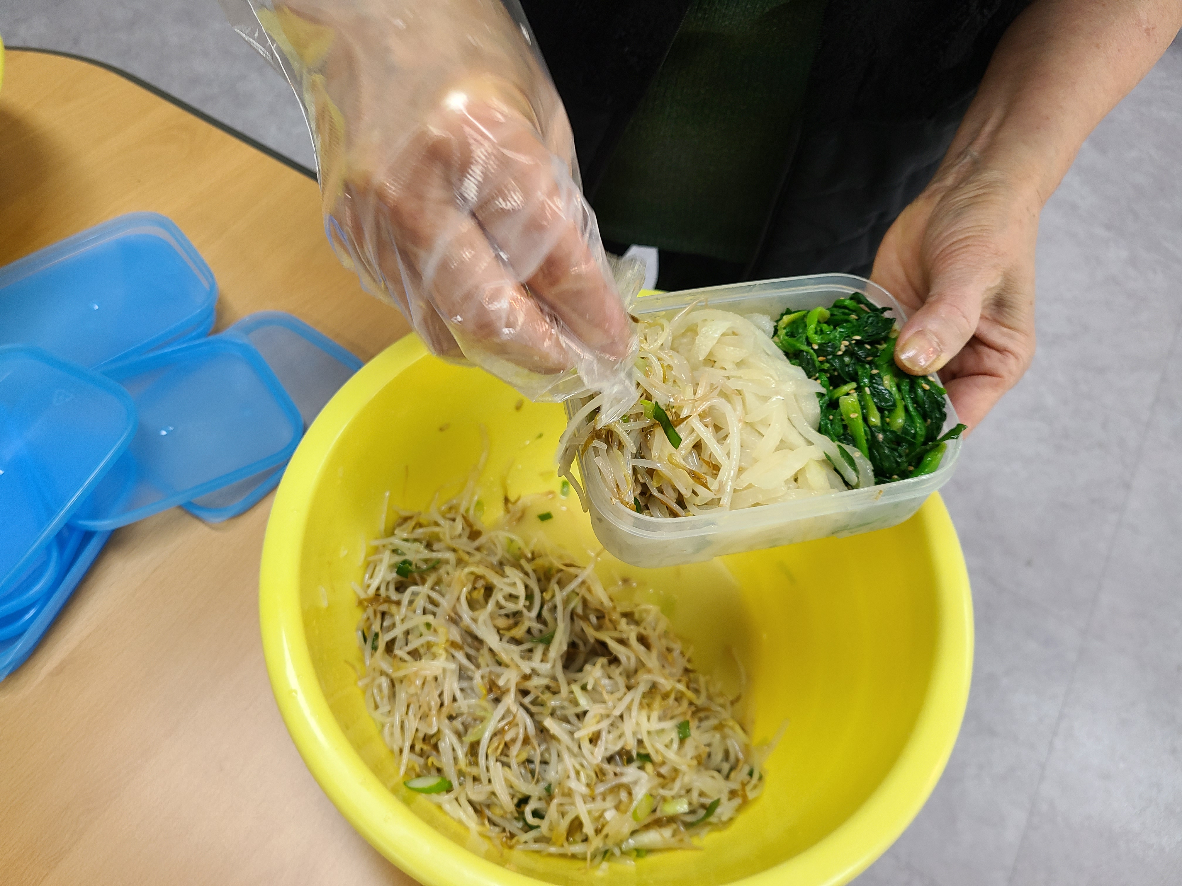 나 반장님께서 보기 좋아야 음식도 맛있다며 시금치나물을 반찬통 가운데에 놓으셨습니다.