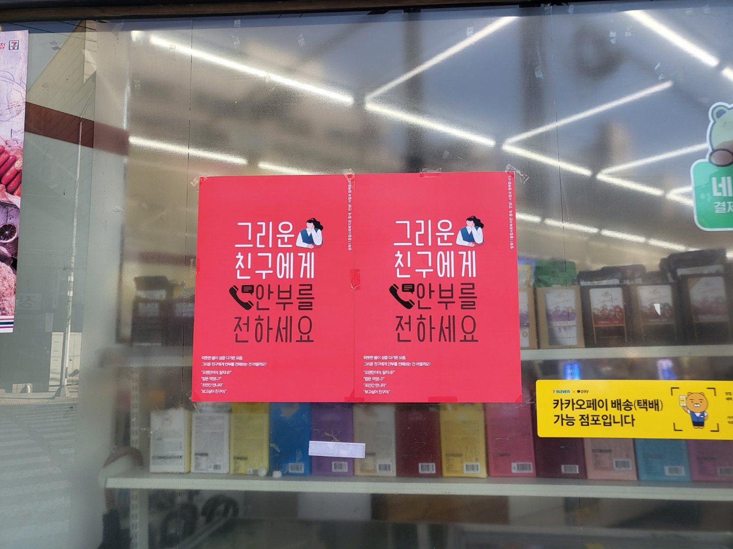 포스터를 붙이고 있는 저희 대신 사장님이 이웃에게 직접 인사캠페인을 설명하고 소개했습니다.