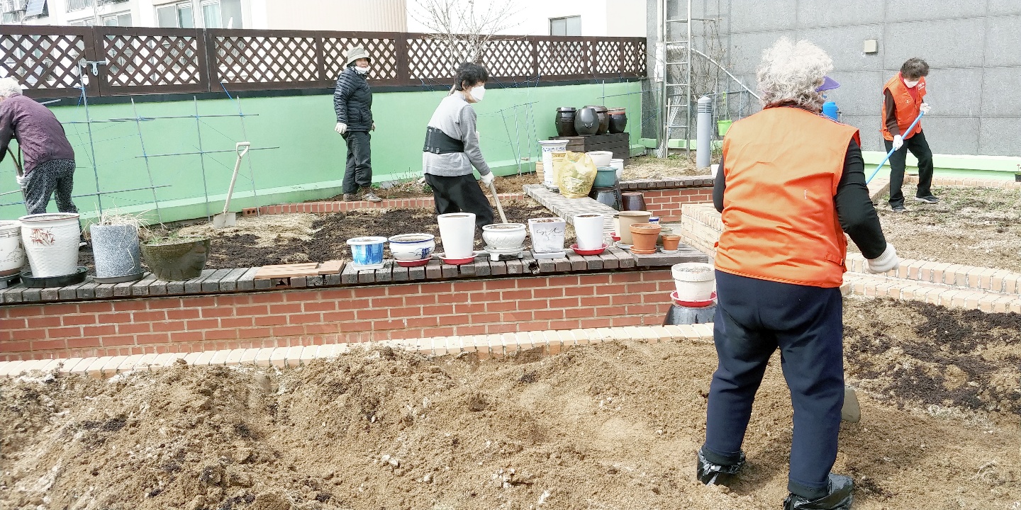 복지관 앞마당 나눔터텃밭으로 내려와 흙갈이를 열심히 진행하고 있었습니다.