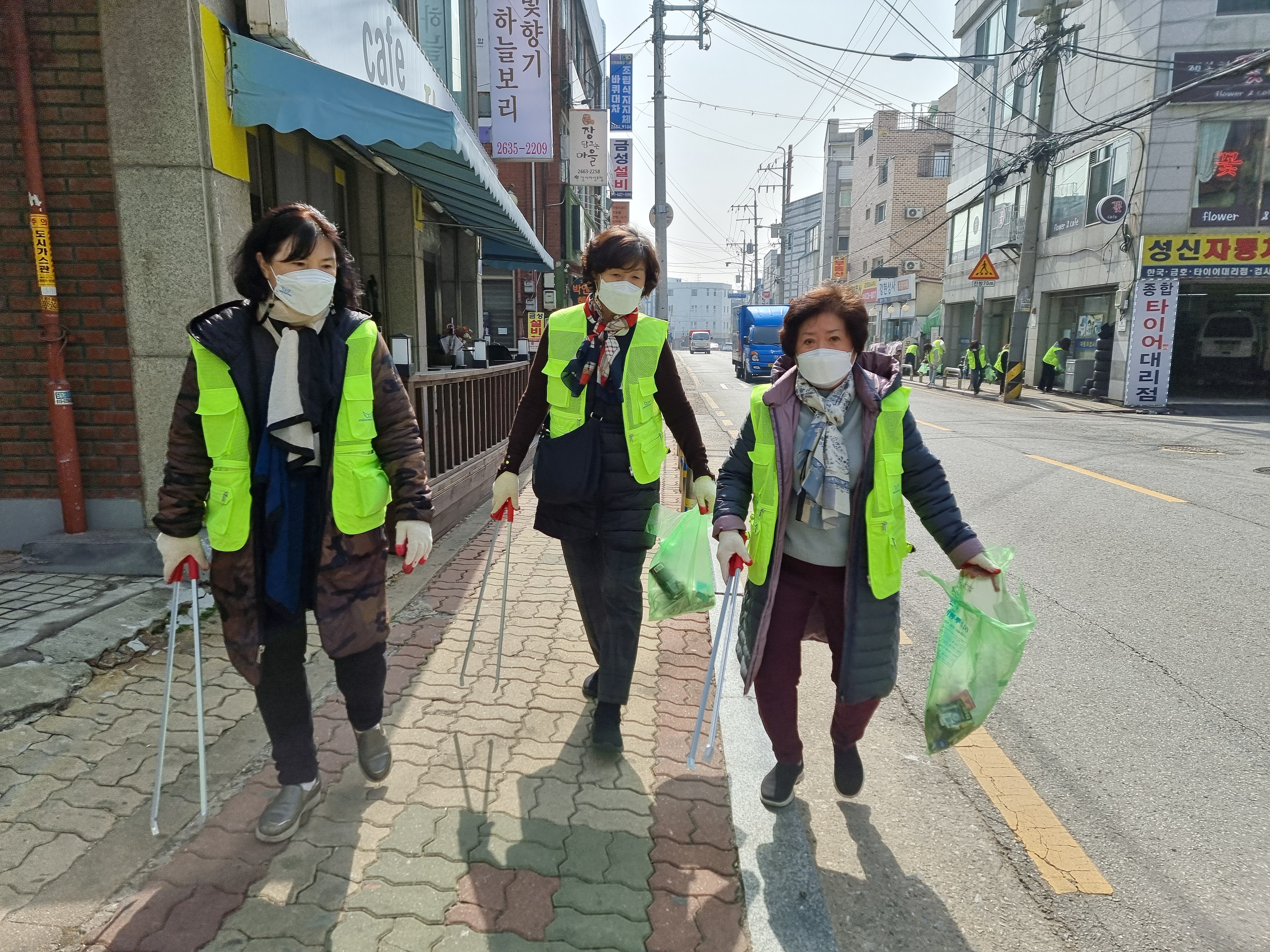 소독하는 사람, 집게 집고 청소하는 사람, 사진을 찍는 사람, 소식지 공항동감을 나누는 사람.