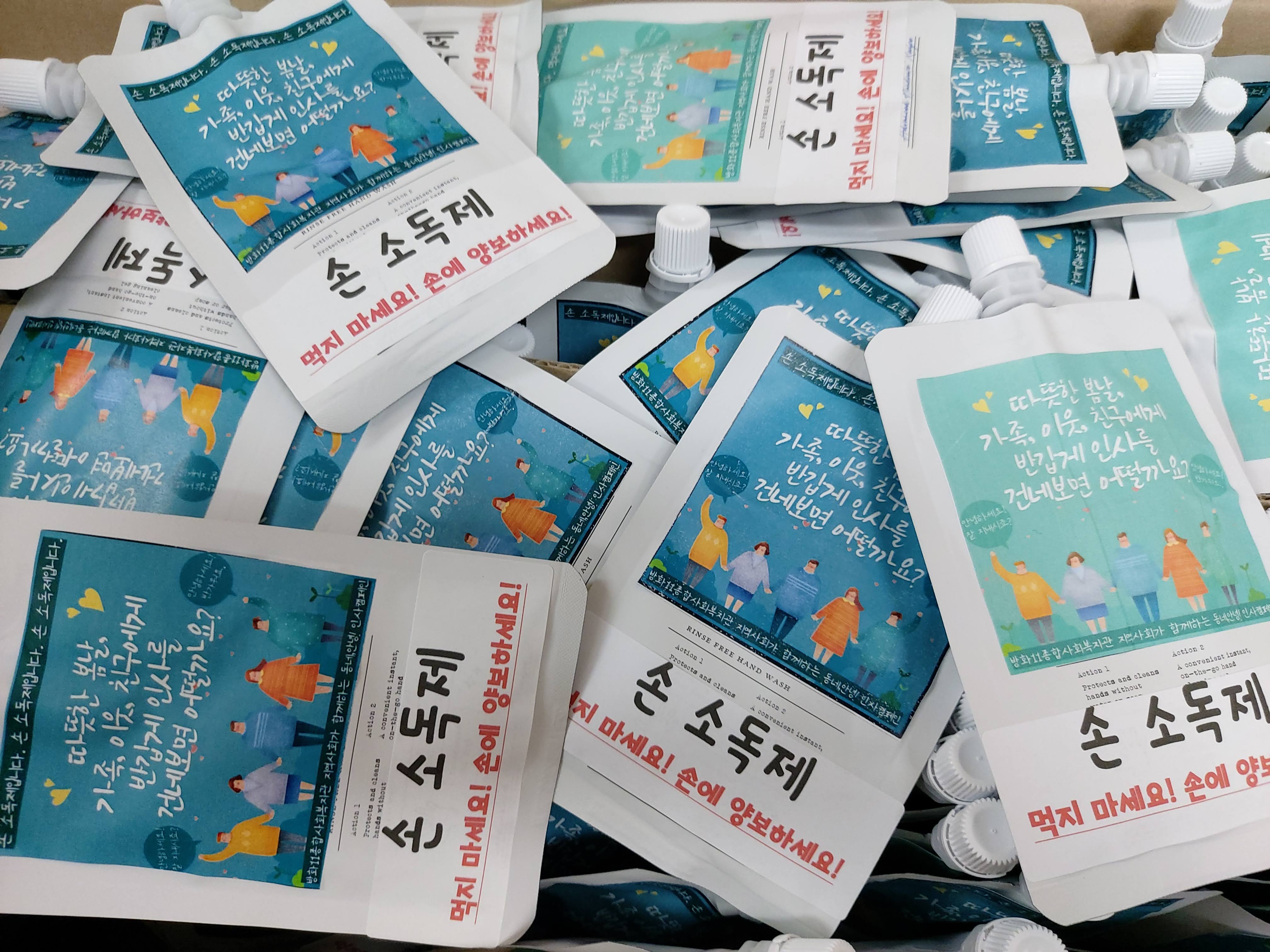 코로나 시기로 많이 쓰실 손소독제에 인사 문구를 붙여 준비했습니다.