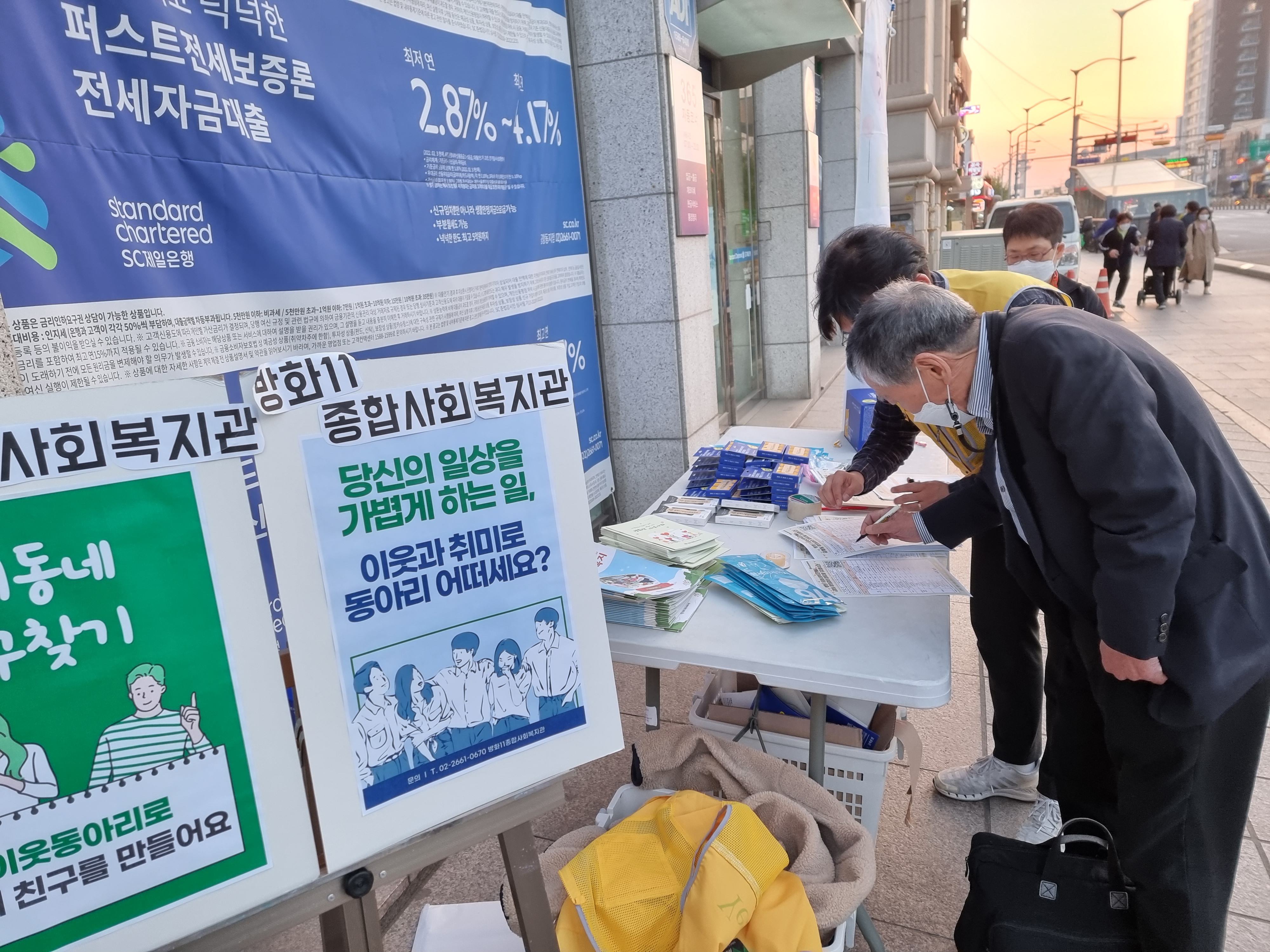 바쁘게 지나가는 주민들이 집에 가서라도 이웃기웃 홍보지를 보실 수 있게