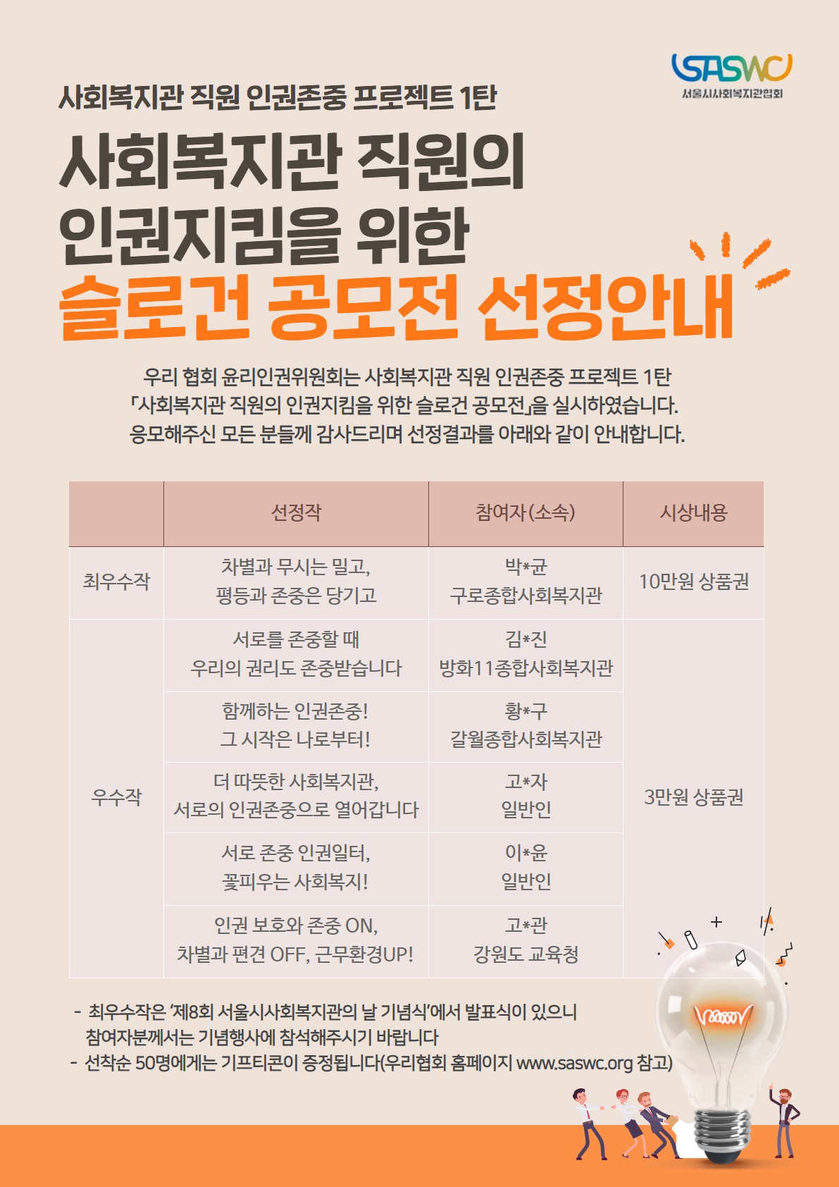 지난 4월, 서울시사회복지관협회에서 '직장 내 위기상황에서 근무하는 사회복지관 직원의 인권을 보호를 위한 슬로건 공모전'을 실시하였습니다.