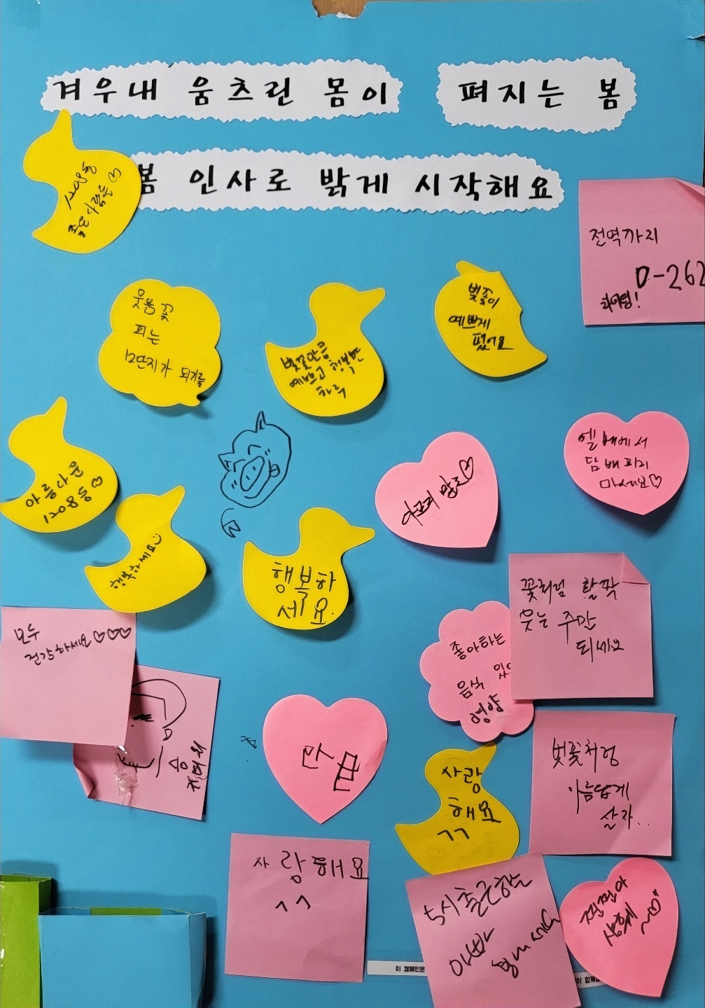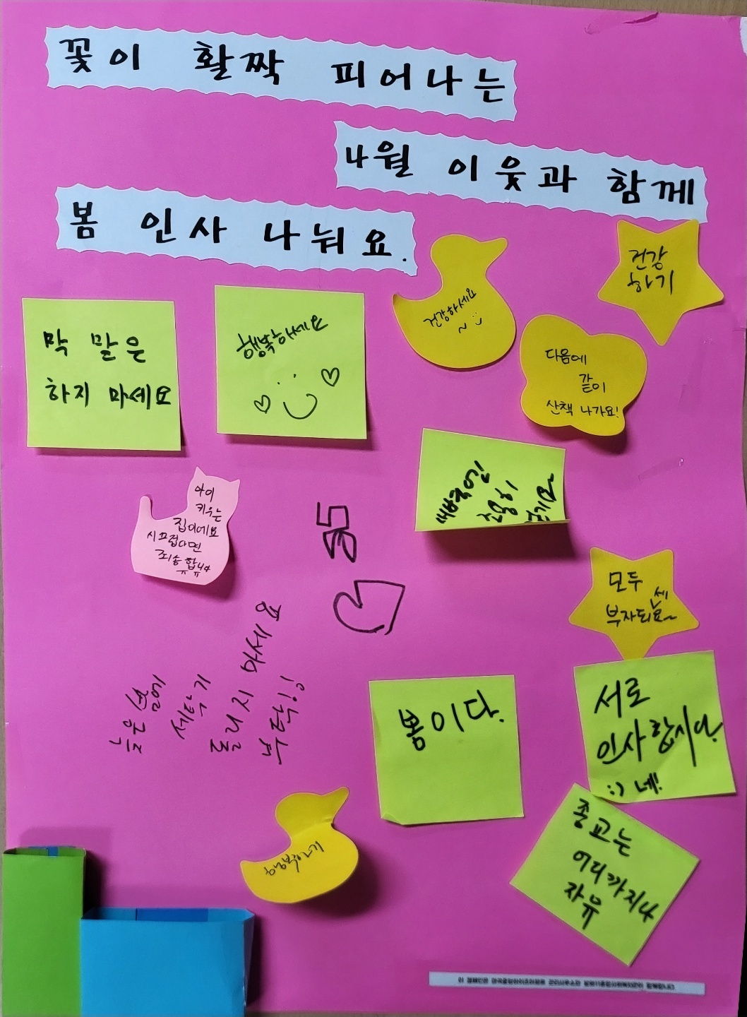 '이웃과 함께 봄 인사 나눠요' 라는 문구로 봄 인사 나눌 수 있게 붙임쪽지판에 붙였습니다.