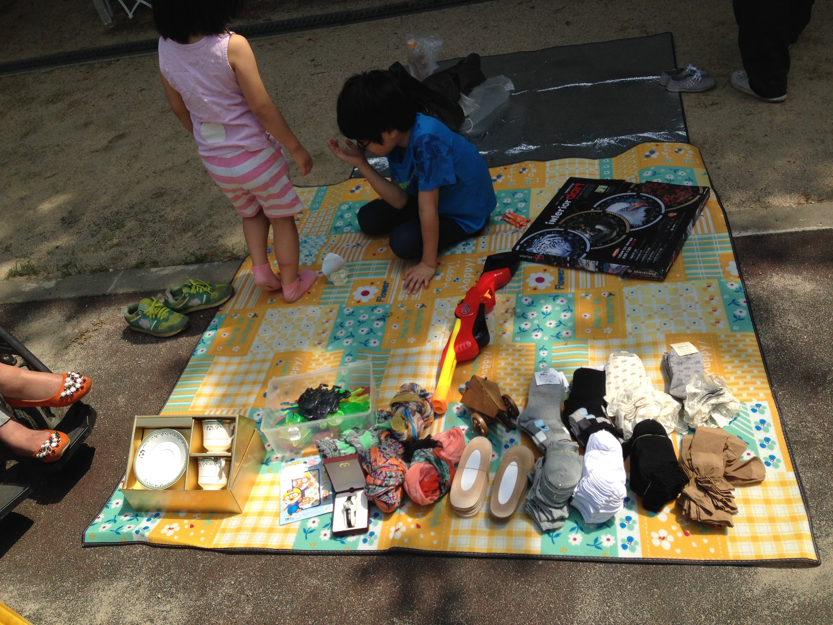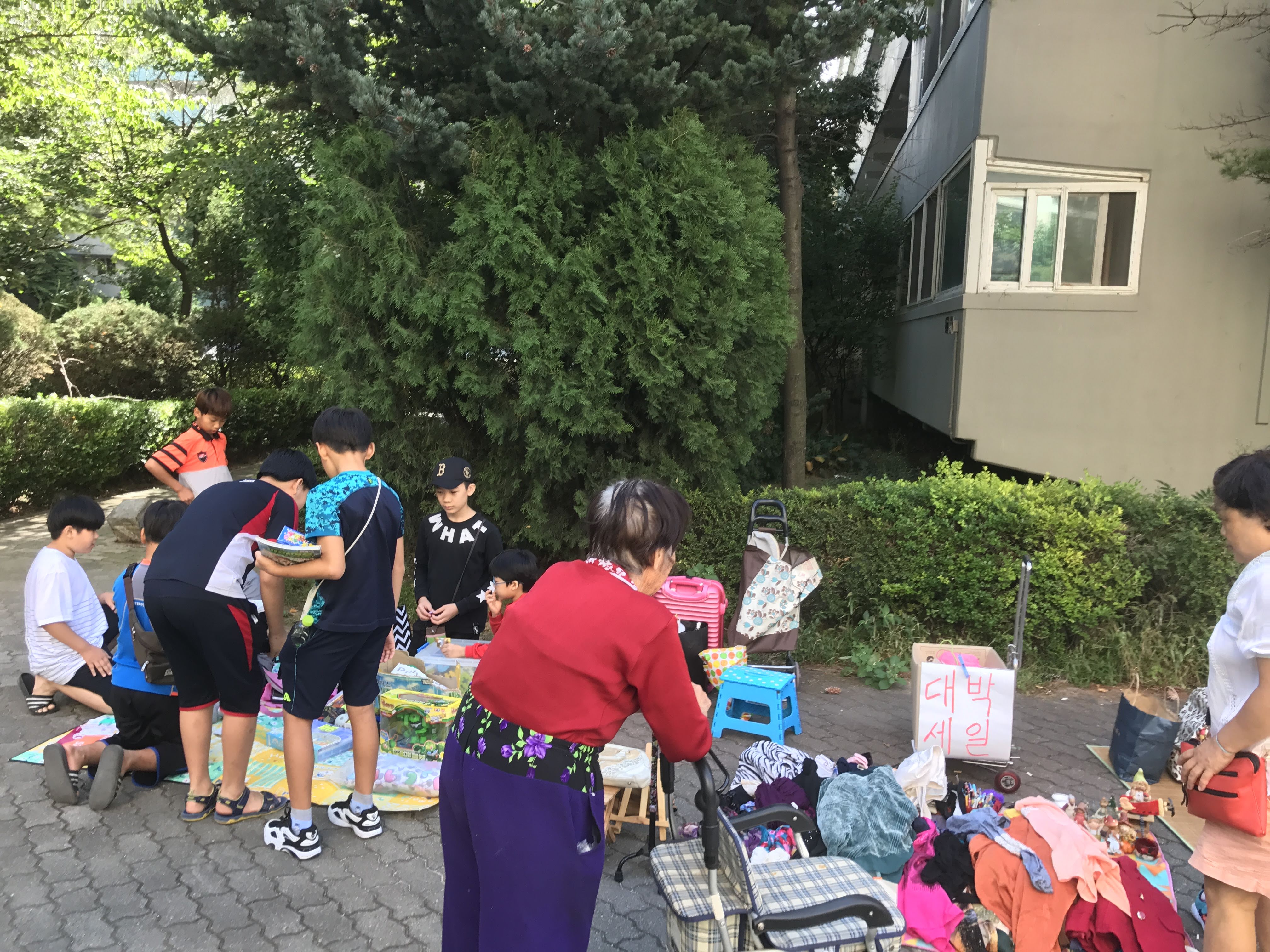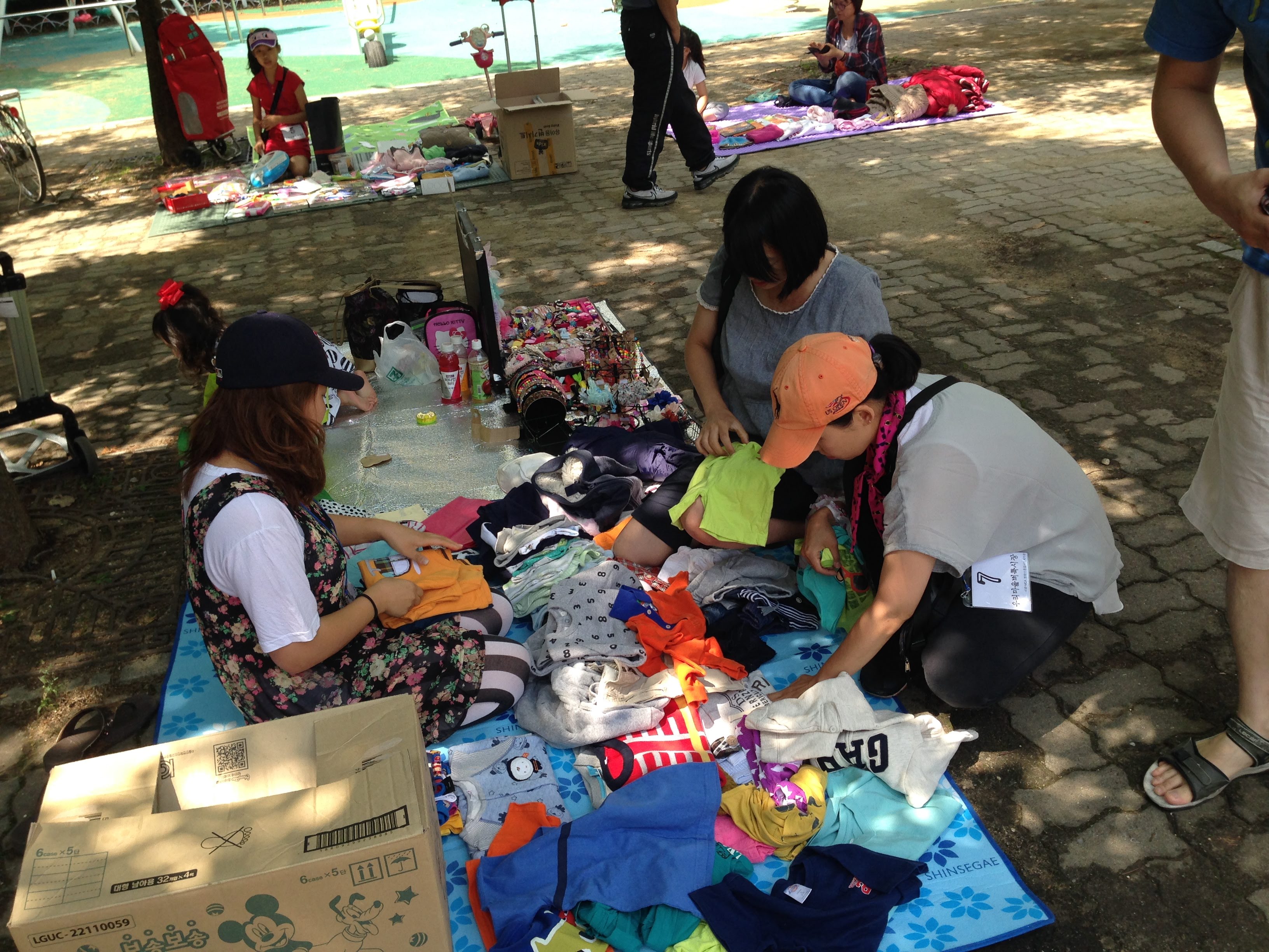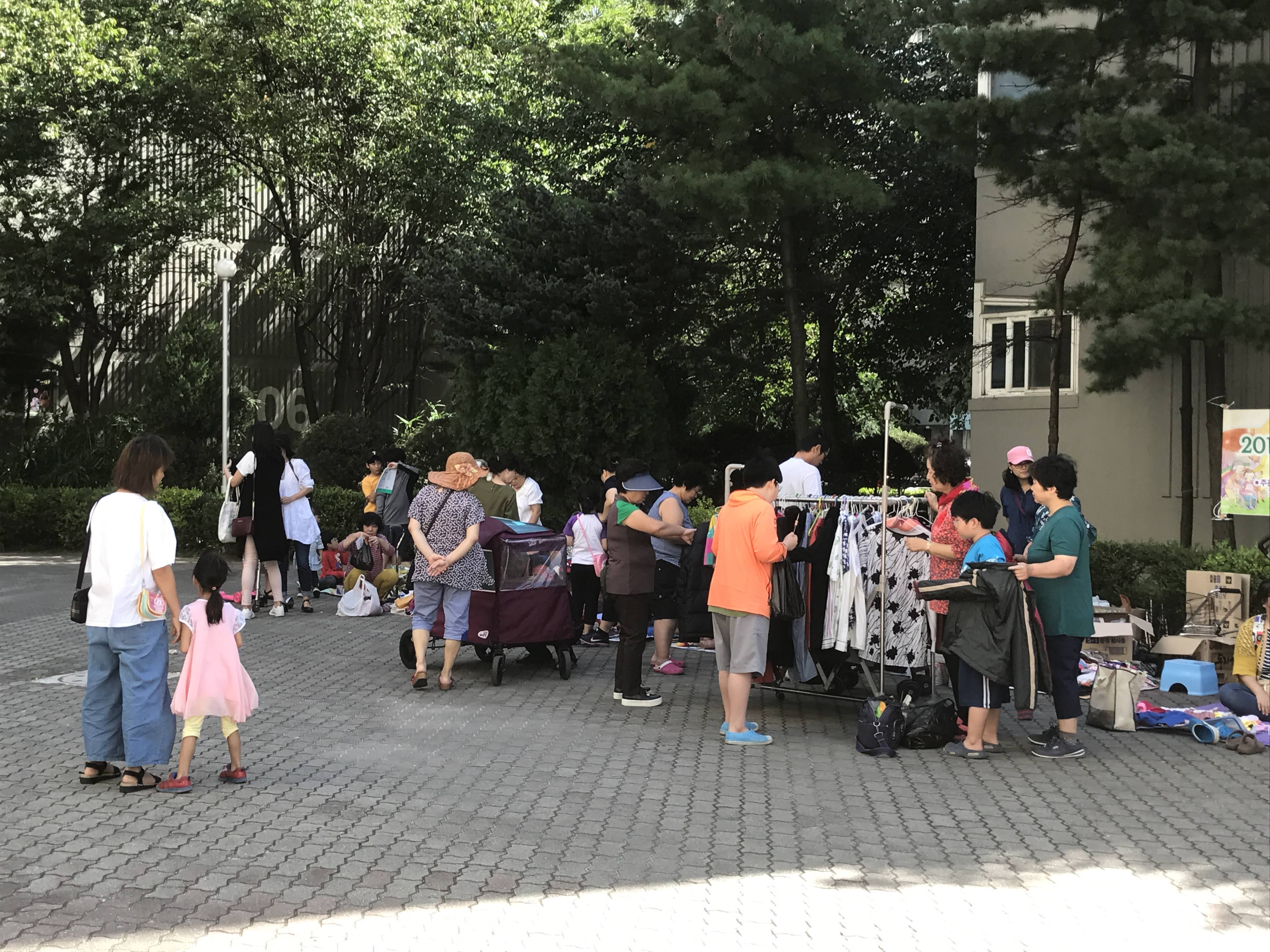 복지관 앞마당에서 본인이 나눔할 물건으로 마켓을 엽니다.