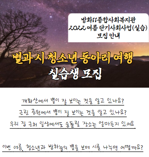 [단기사회사업] '별과 시 청소년 동아리 여행' 실습생 모집