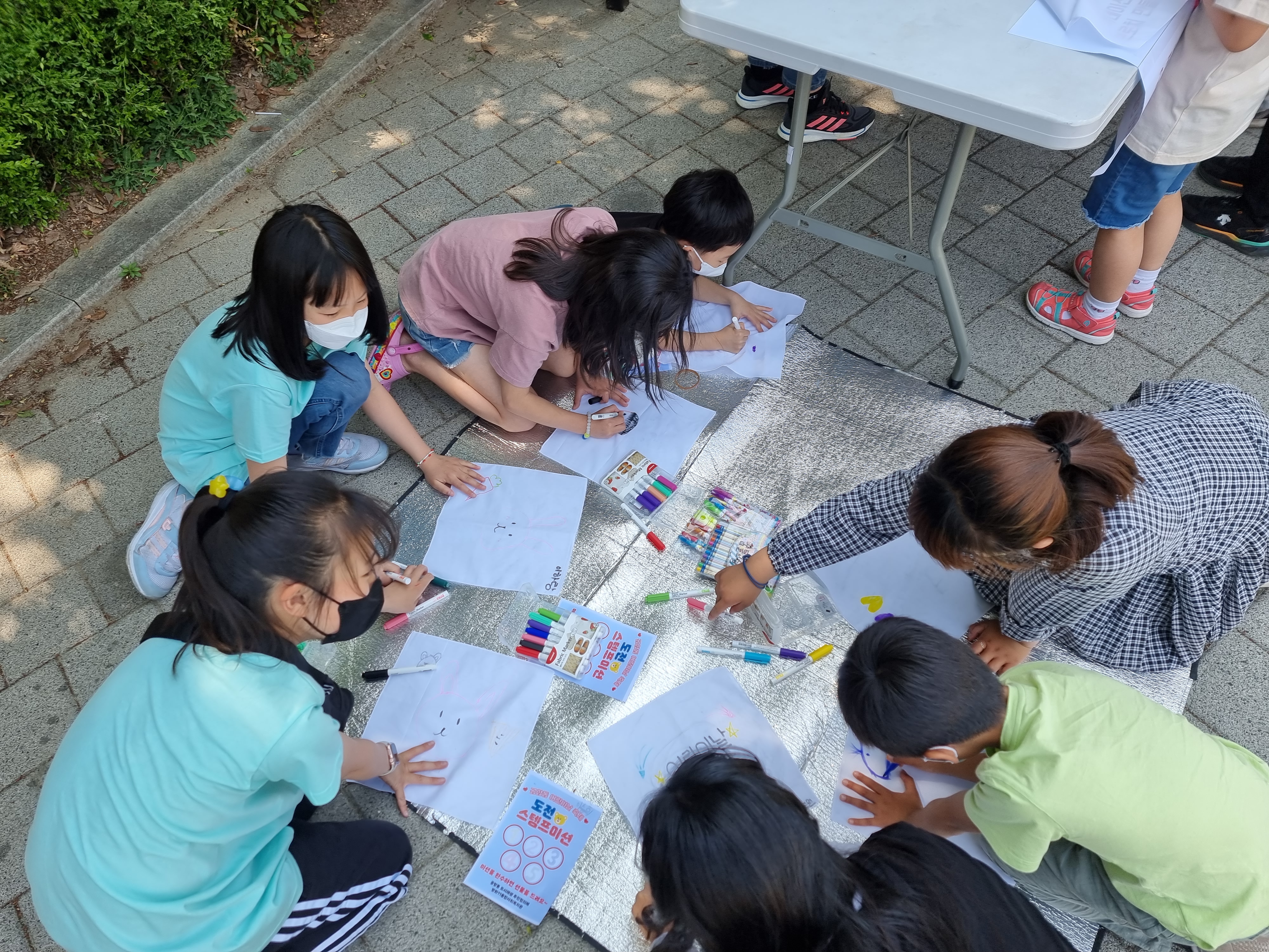 아이들이 서늘한 그늘에 앉아 그림그리고 멋진 작품을 얻어갔습니다.