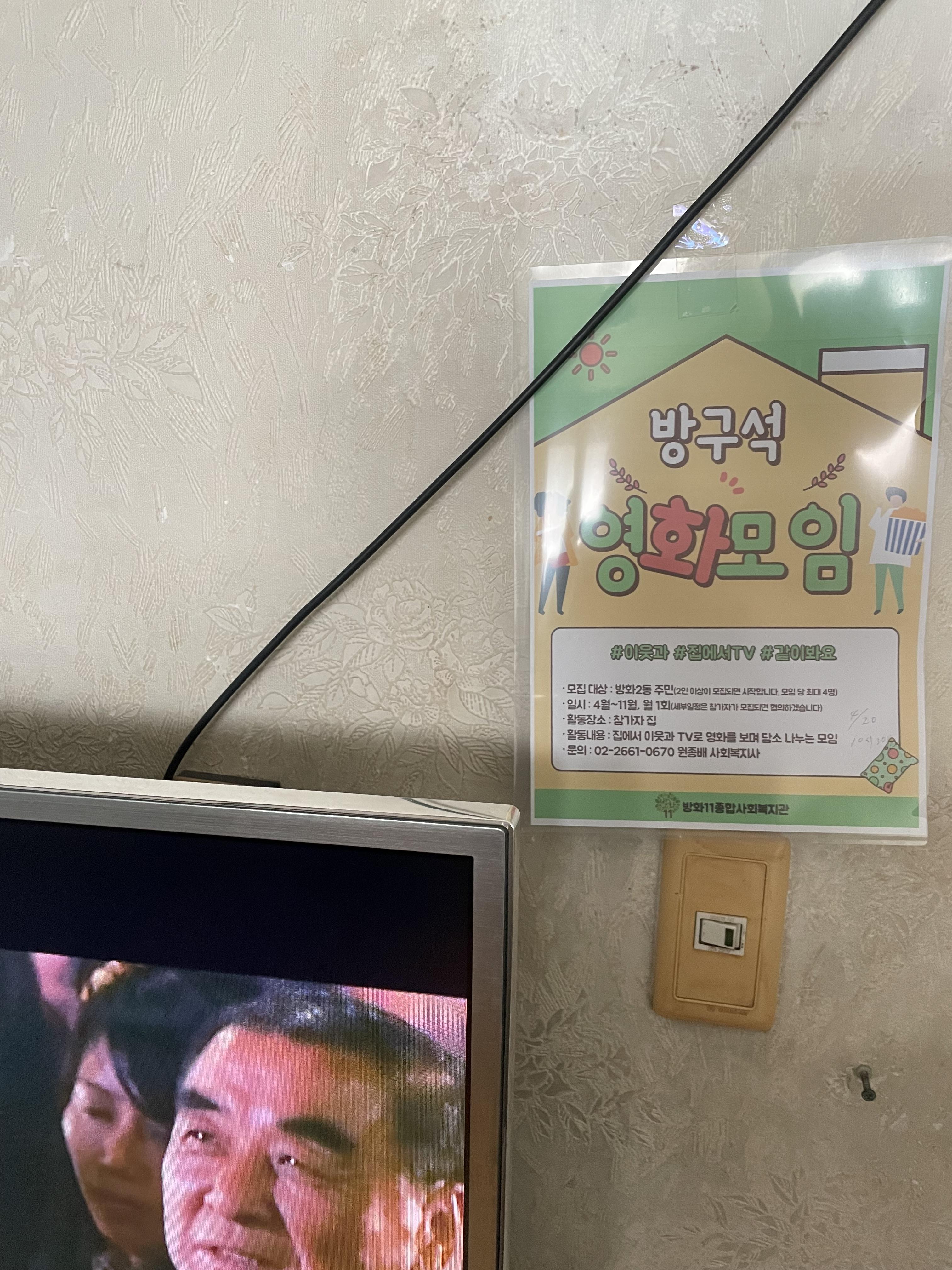 오 씨 할머니께서 TV가 있는 안방 한켠에 방구석 영화모임 홍보지를 벽에 붙여놓으셨습니다.