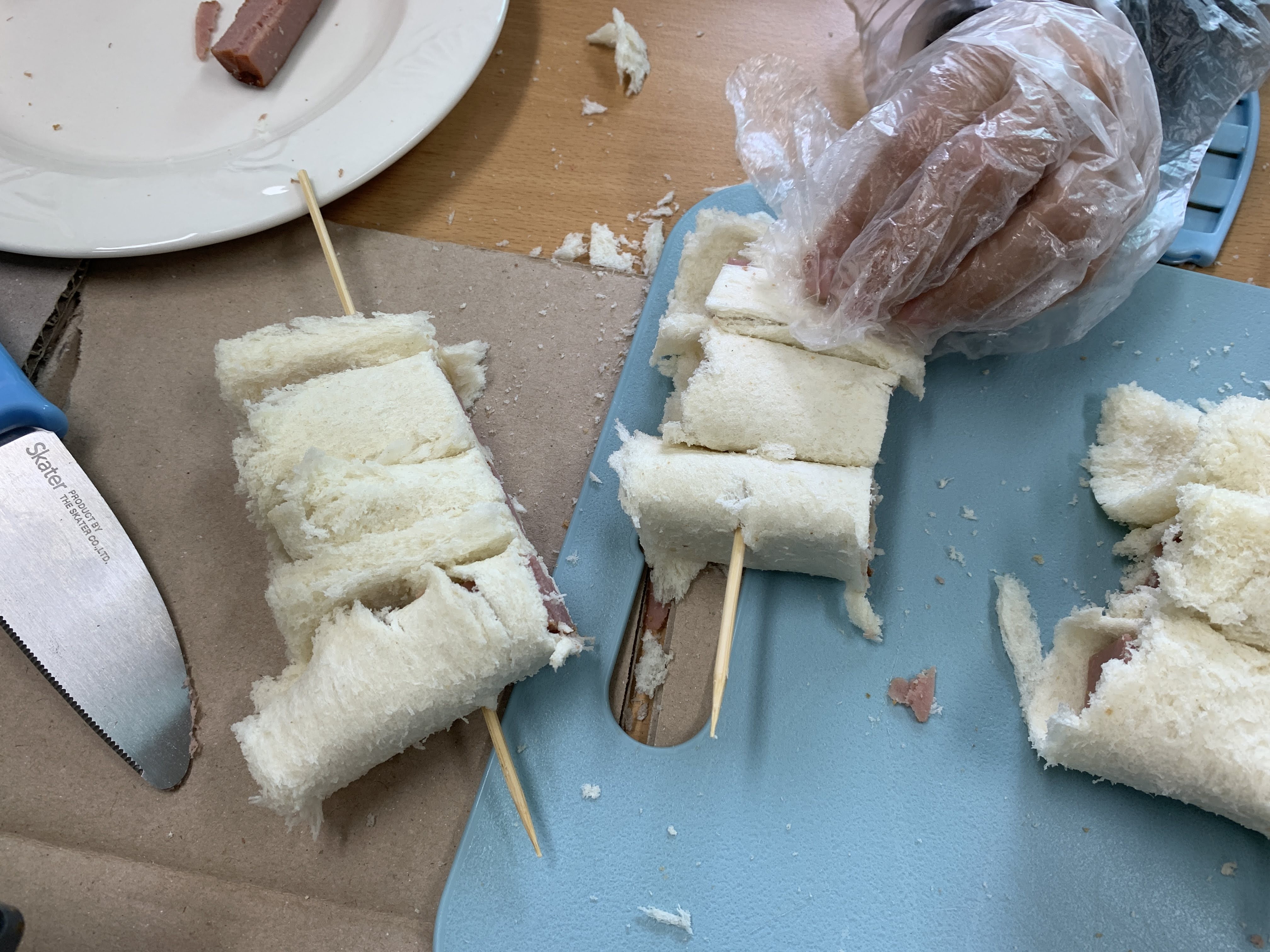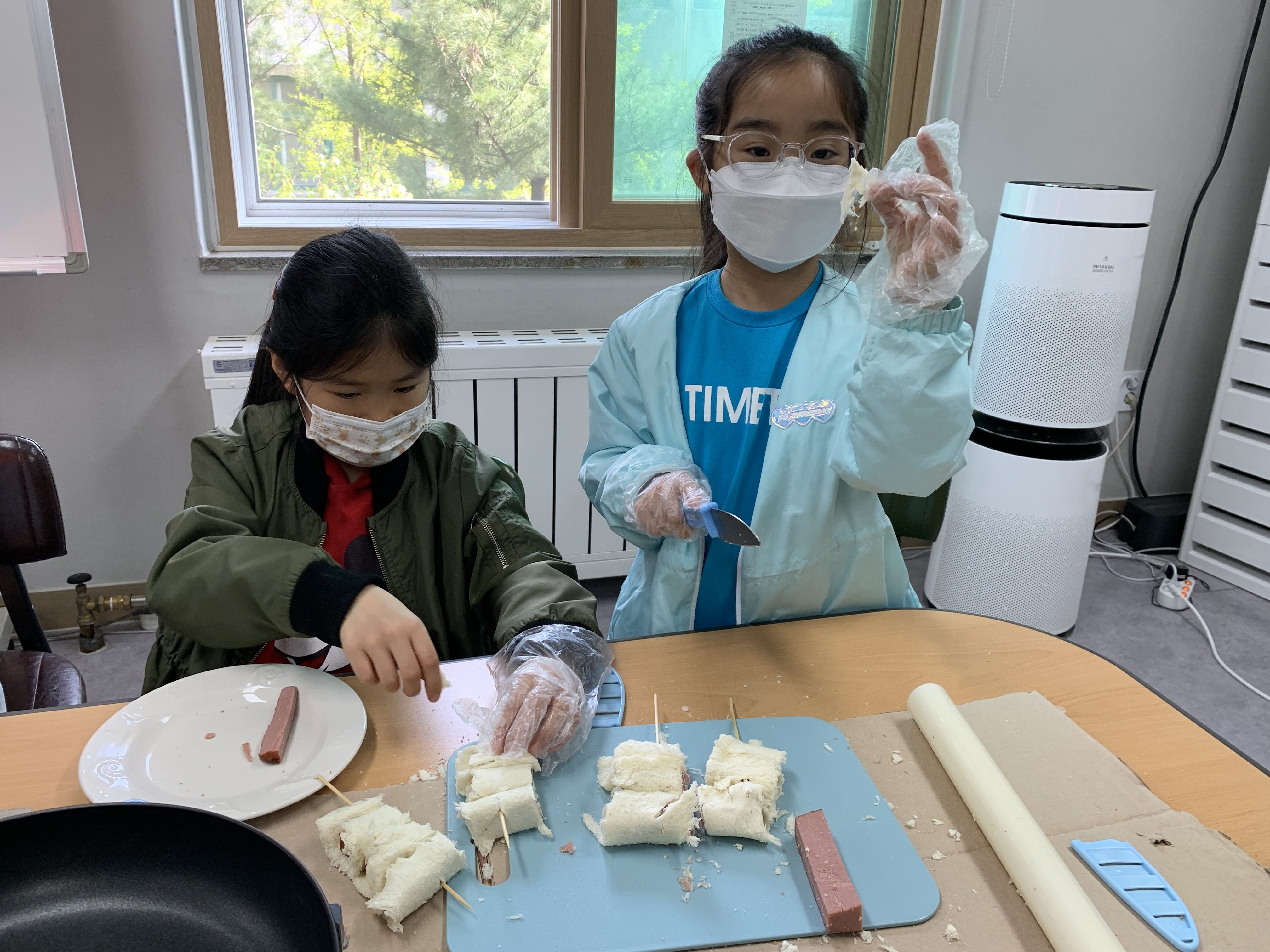 각자 자리에 앉아 식빵 테두리를 자르고, 식빵을 밀대로 밀어 펼친 후 햄에 돌돌 말아 꼬치에 꽂았습니다.