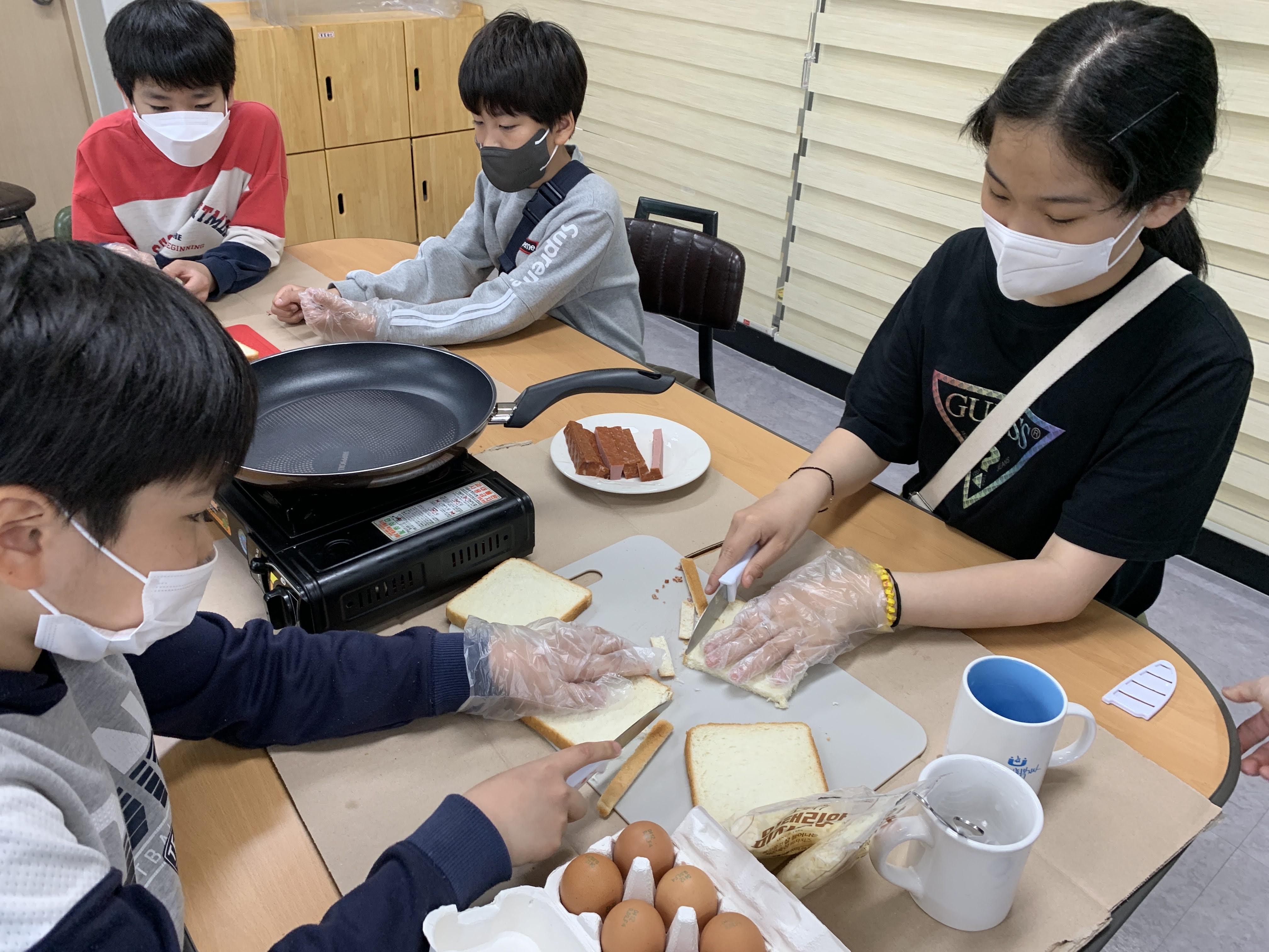 선생님께 인사드린 아이들이 각자 챙겨온 재료를 꺼내어 식빵 롤 구이 만들기를 준비를 시작했습니다.