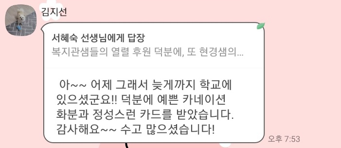 선생님이 감사인사와 카네이션, 손편지를 보시고