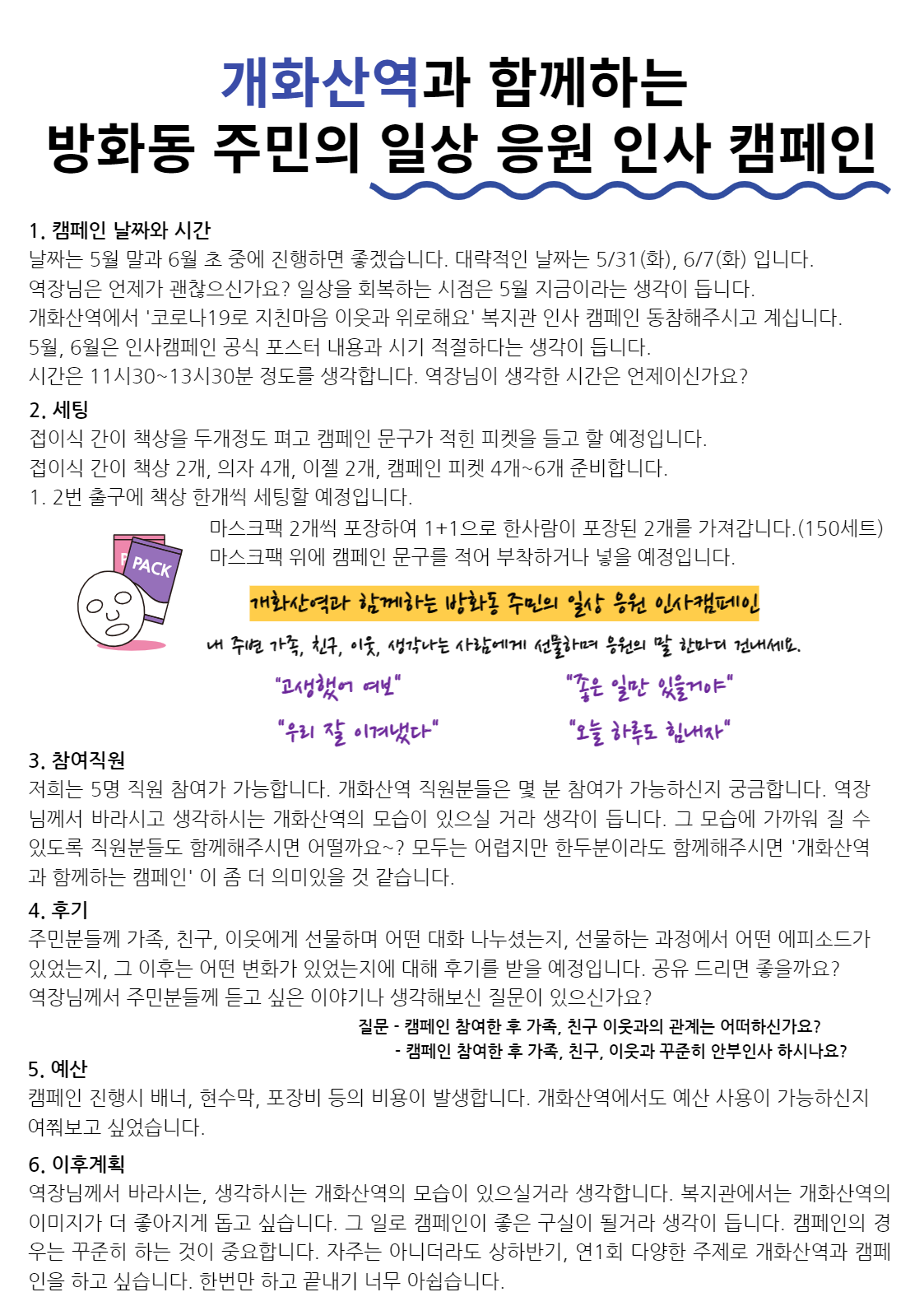 팀원들과 의논한 결과 1안으로는 개화산역과 함께하는 캠페인을 진행해보기로 했고, 2안으로 상가 앞 마스크팩 비치 또는 어린이집과 연계한 캠페인을 해보기로 했습니다.