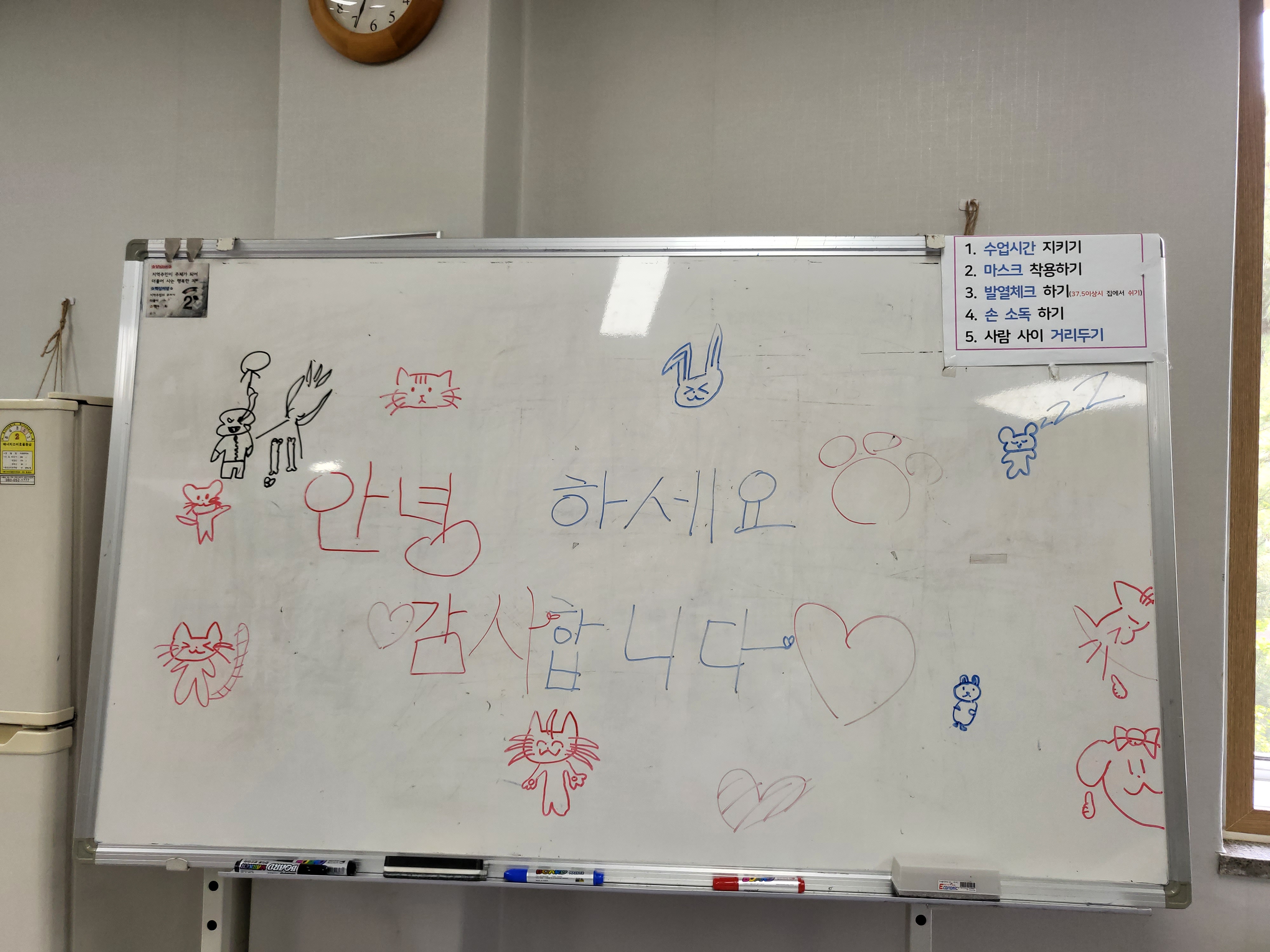 몇몇 아이들은 칠판에 선생님을 환영하는 문구를 적기도 합니다.