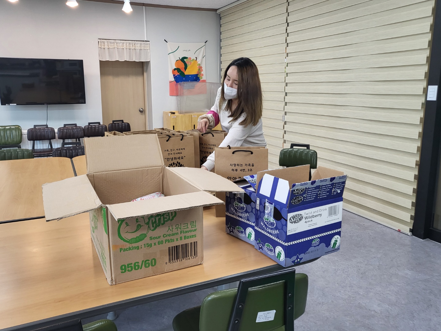과자 꾸러미와 함께 후원품으로 들어온 음료수를 같이 쇼핑백에 담아 전달하기로 했습니다.