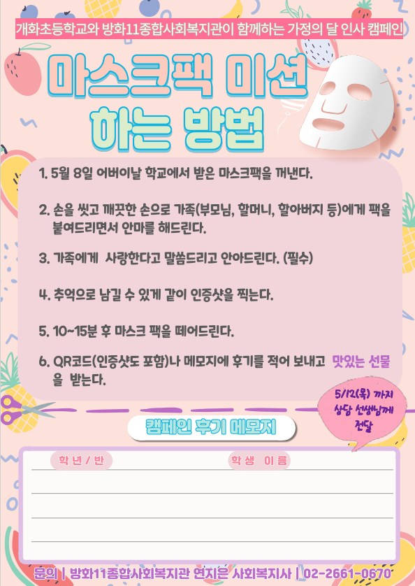 학생들이 마스크팩 인사캠페인을 구실로 일상생활에서 꾸준히 가족과 마음 나눔을 실천하기를 소망합니다.