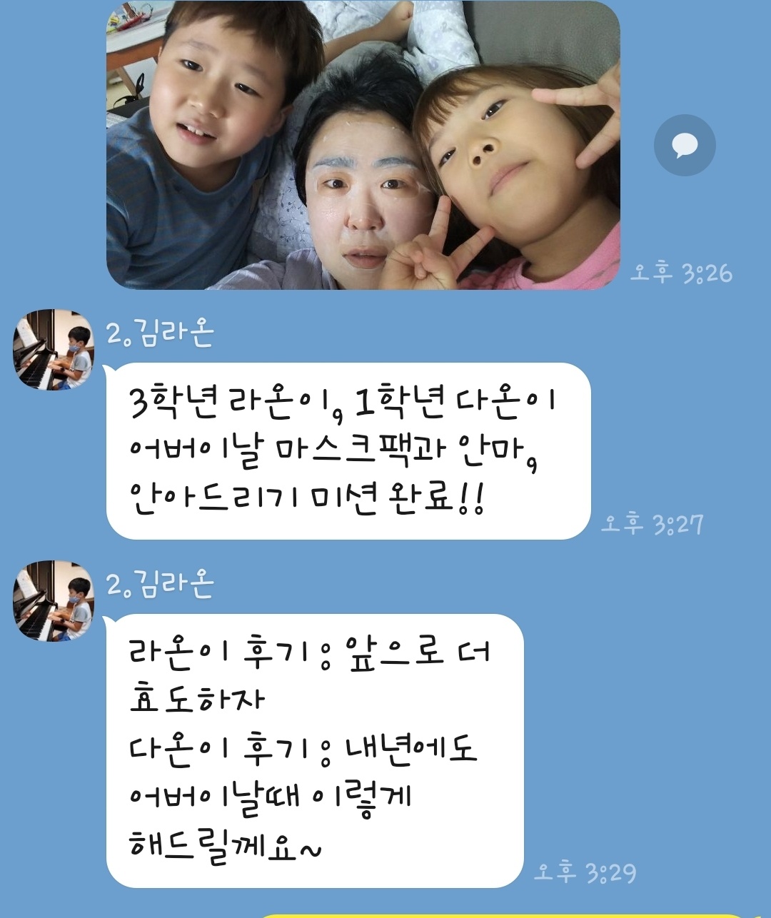 28. 김*우 : 어버이날을 맞아 고생하시는 아빠께라며 마스크팩을 붙여주는 개화초등학교 김근우입니다. 어버이날 이벤트이지만 부자간의 즐거운 추억 만들어주셔서 감사드립니다. 좋은 프로그램 만들어 주셔서 감사합니다.