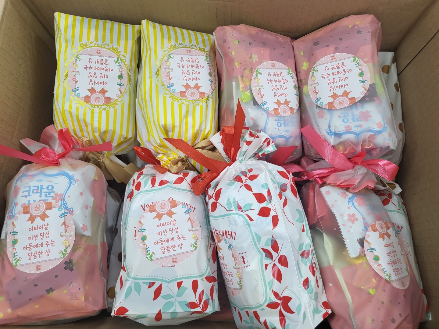 과자 꾸러미에는 '어버이날 미션 달성 아동에게 주는 달콤한 상'이라는 문구를 넣었습니다.