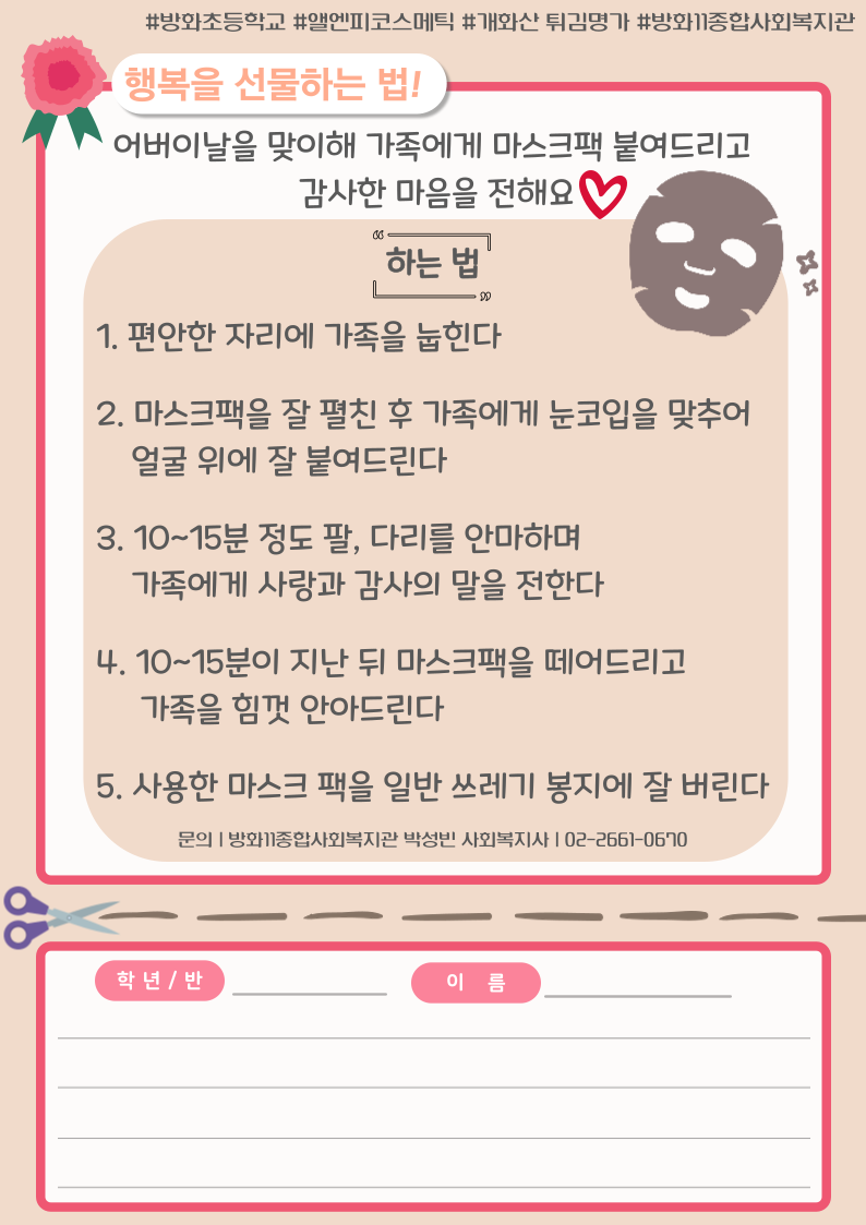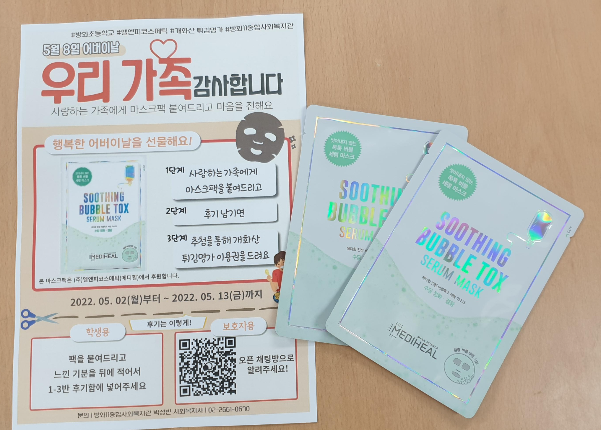 각 반에서 가정통신문으로 홍보지와 마스크팩 2개를 가정으로 보냈습니다.