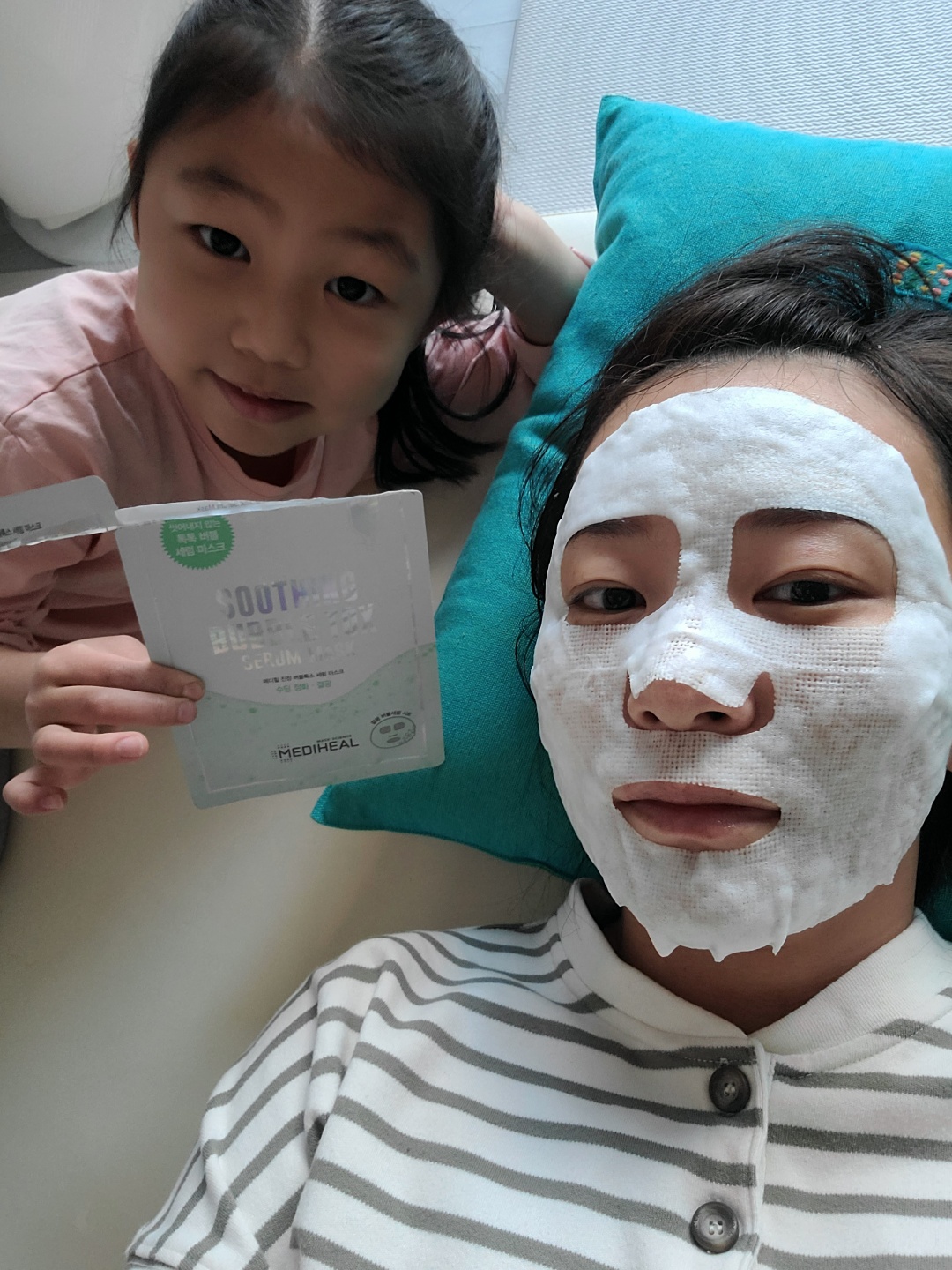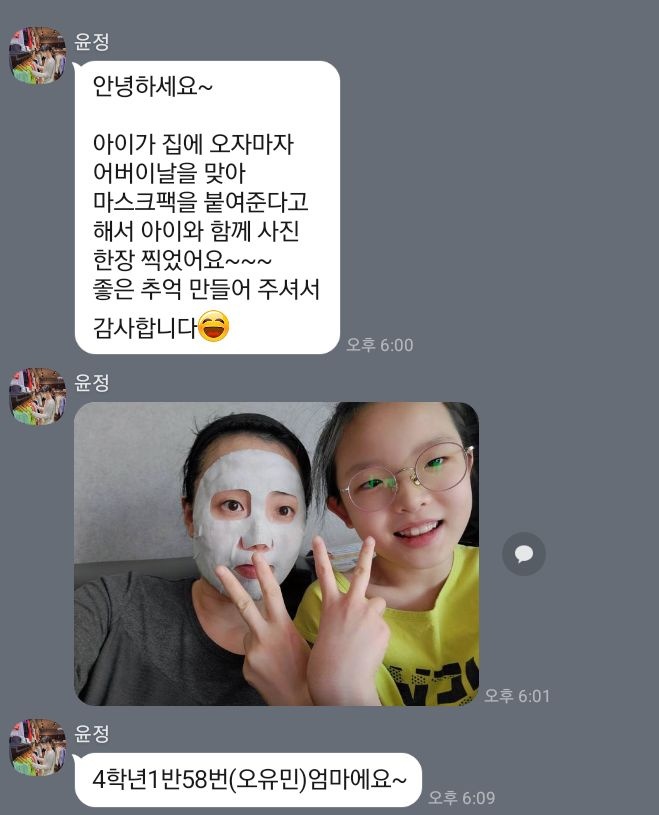 아이가 집에 오자마자 어버이날을 맞아 마스크팩을 붙여준다고 해서 아이와 함께 사진 한장 찍었어요~~~ 좋은 추억 만들어 주셔서 감사합니다(방긋)