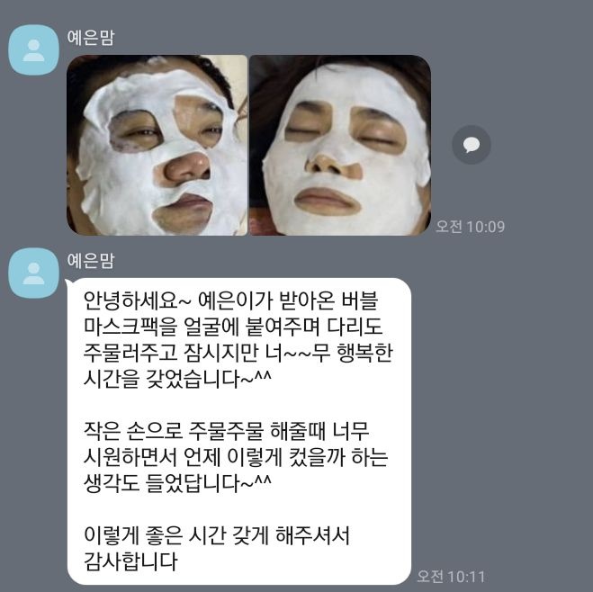 안녕하세요~ 예은이가 받아온 버블 마스크팩을 얼굴에 붙여주며 다리도 주물러주고 잠시지만 너~~무 행복한 시간을 갖었습니다~^^ 작은 손으로 주물주물 해줄때 너무 시원하면서 언제 이렇게 컸을까 하는 생각도 들었답니다~^^ 이렇게 좋은 시간 갖게 해주셔서 감사합니다