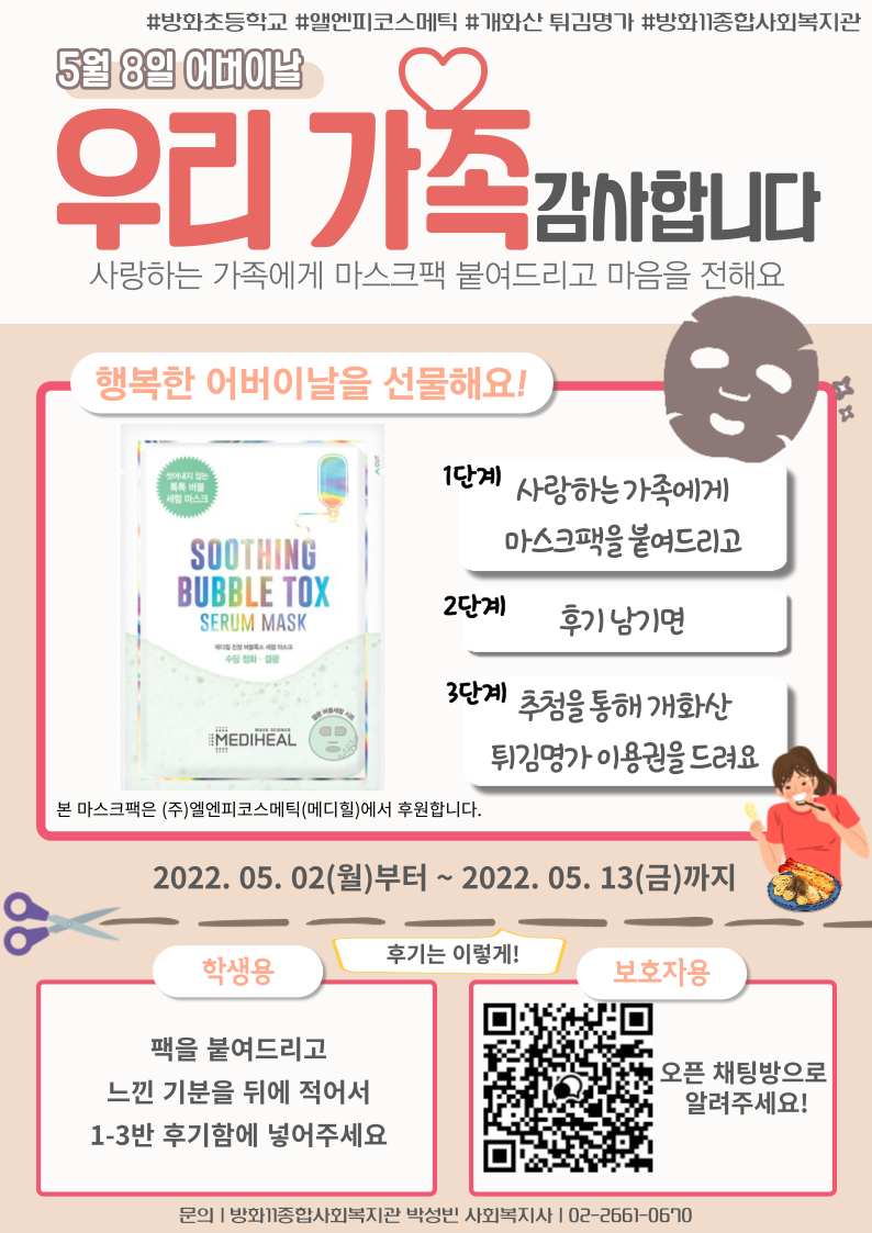 | [동네,안녕!] 개화초등학교 어버이날 마스크팩 인사캠페인 (3) | 2022.06.09 |