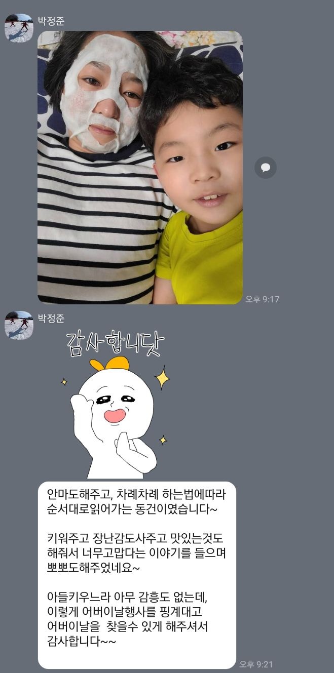 아이가 집에 오자마자 어버이날을 맞아 마스크팩을 붙여준다고 해서 아이와 함께 사진 한장 찍었어요~~~ 좋은 추억 만들어 주셔서 감사합니다(방긋)