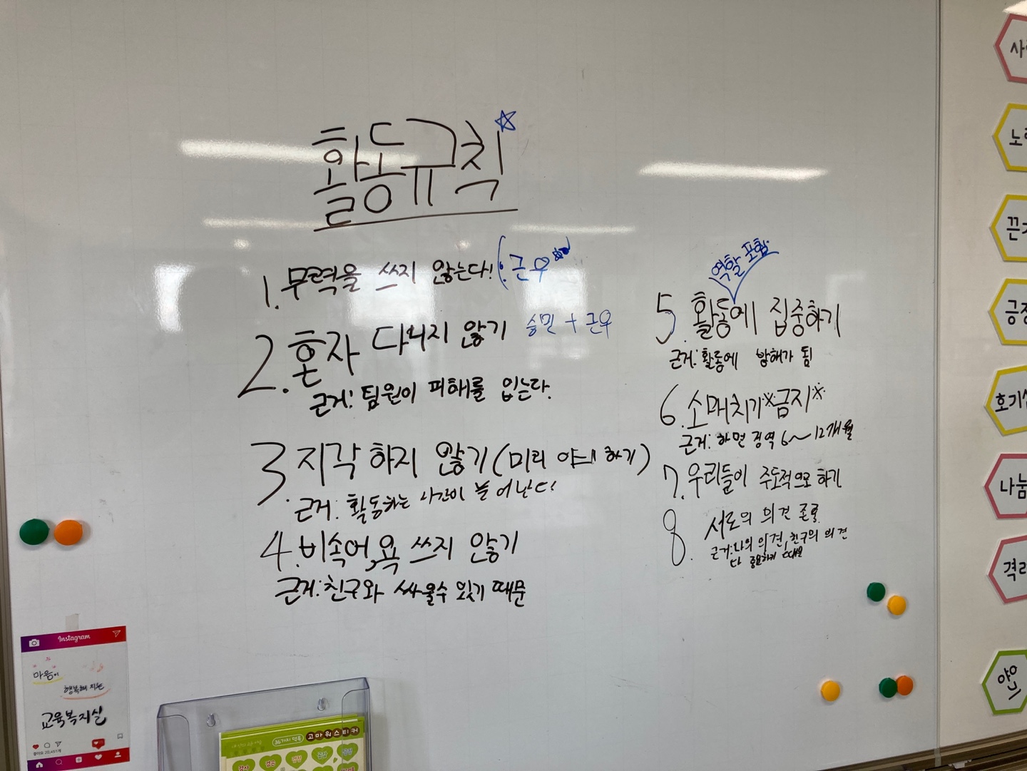 ‘~하기’라는 긍정적 표현으로 규칙을 많이 정하면 좋겠다고 이야기했습니다.