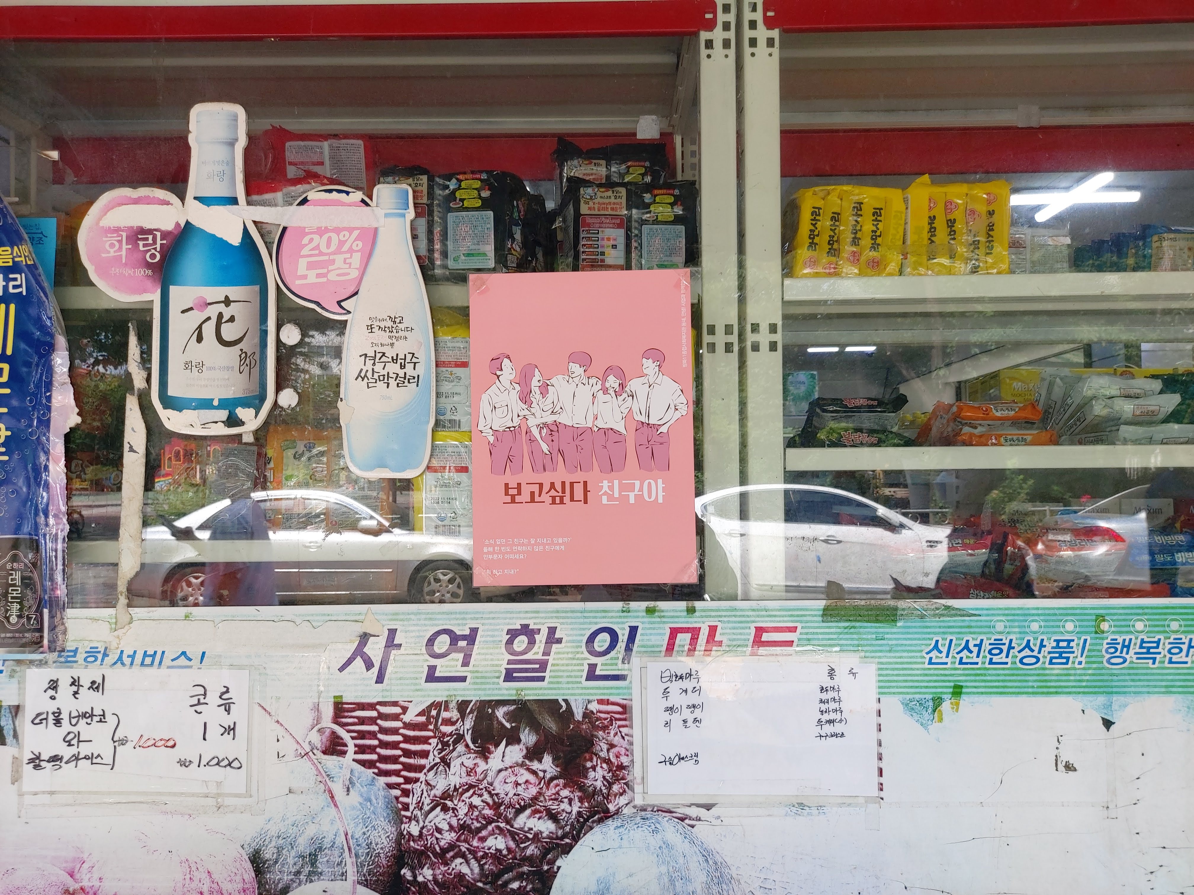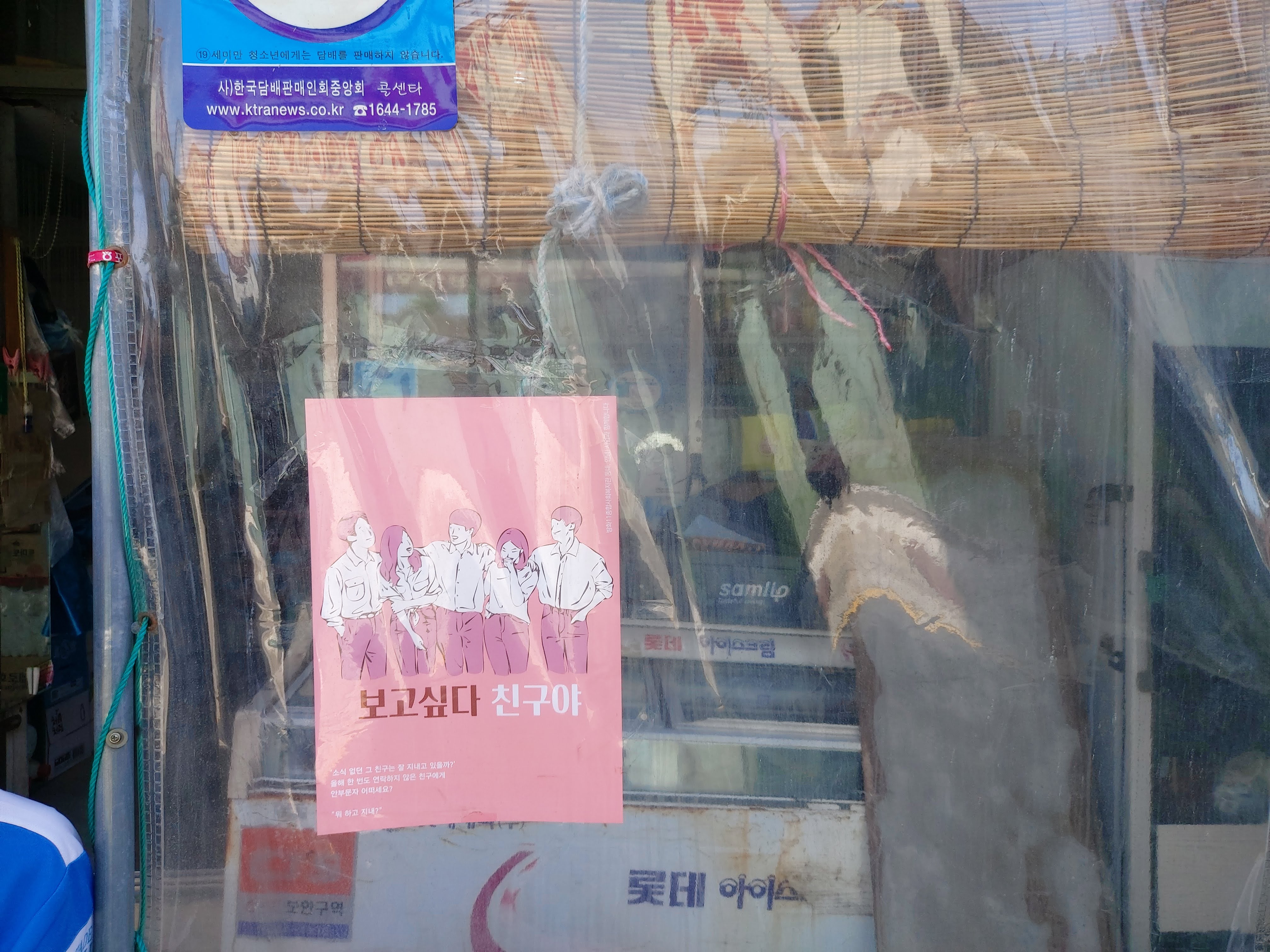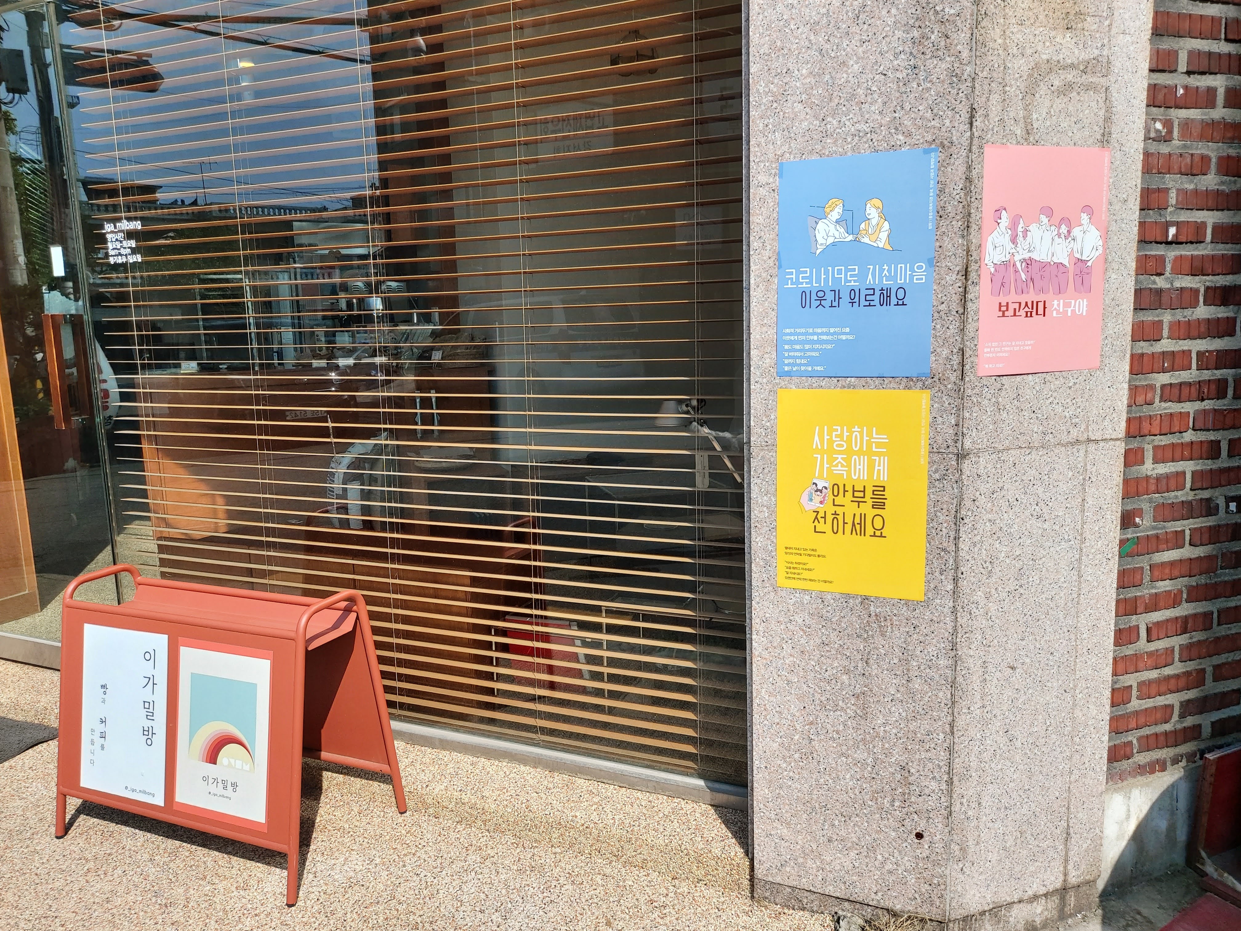 이가밀방에서는 포스터가 건물 밖으로 차곡차곡 쌓여서