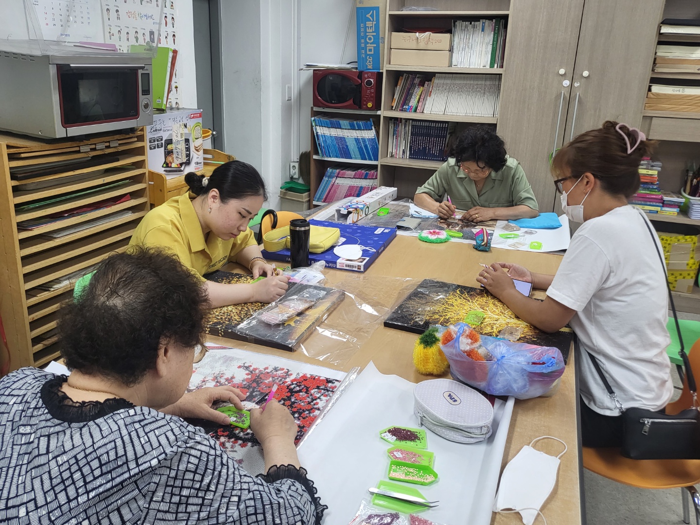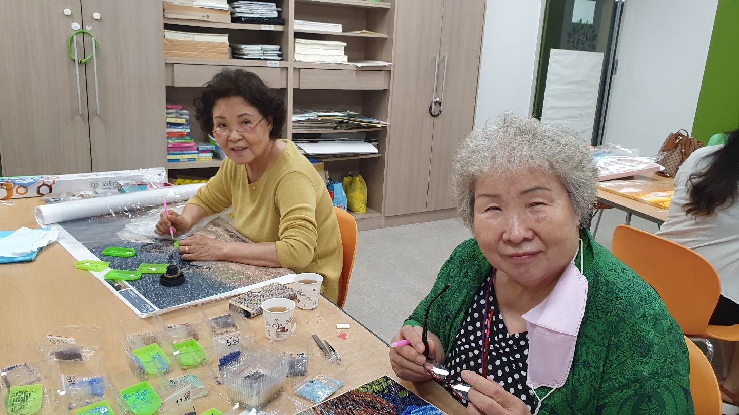 보석십자수 모임에 처음에는 3명이 참여하셨는데 미술 옹기종기 모임에 참여하고 계신 송복남 어르신과 동생분인 송정희 님도 참여하고 싶다고 하셨습니다.