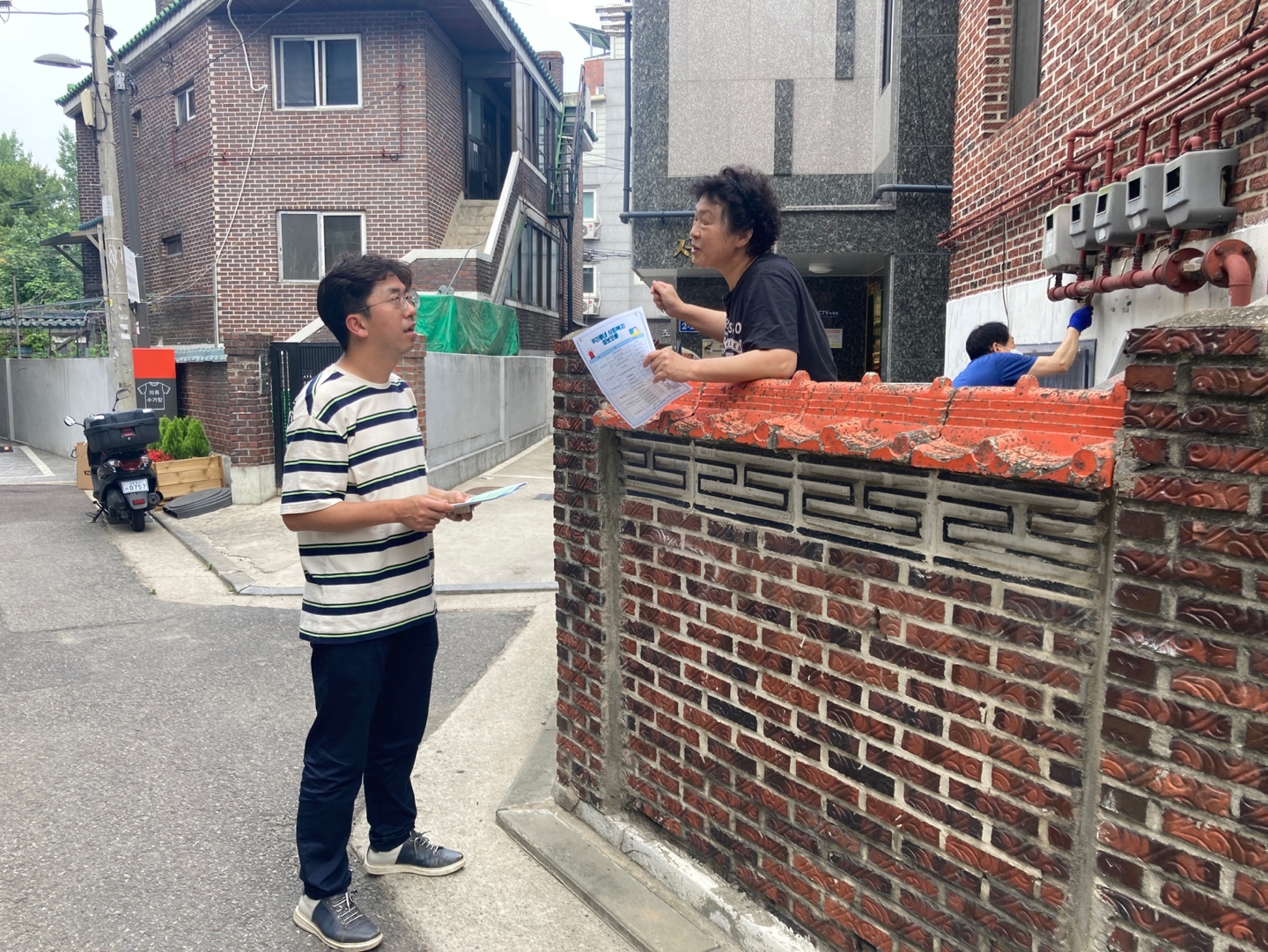 골목을 걷다가 다세대 주택 벽면에 페인트칠을 하고 수리하는 분을 만났습니다.